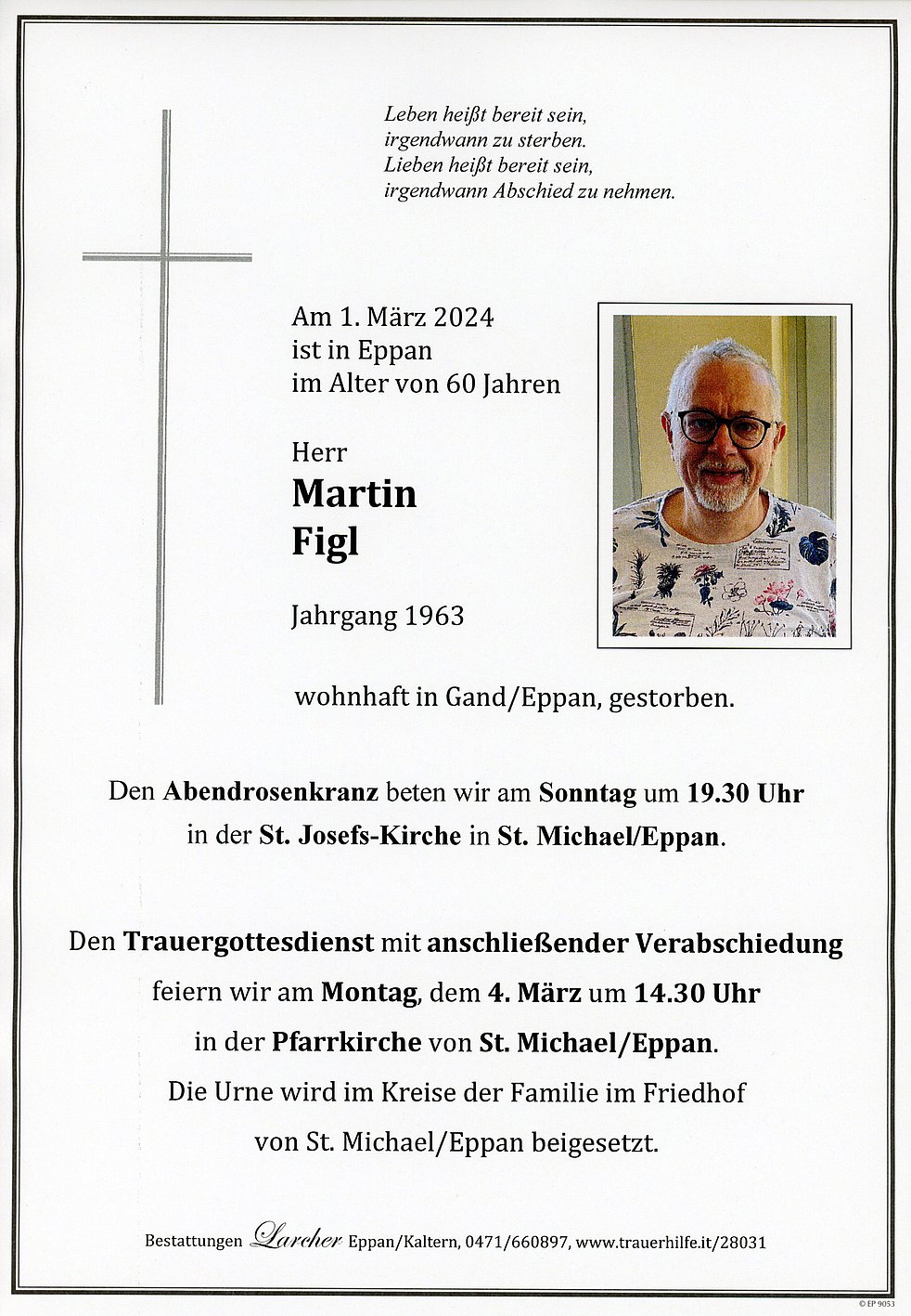 Den Trauergottesdienst mit anschließender Verabschiedung feiern wir am Montag, dem 4. März, um 14.30 Uhr in der Pfarrkirche von St. Michael/Eppan.