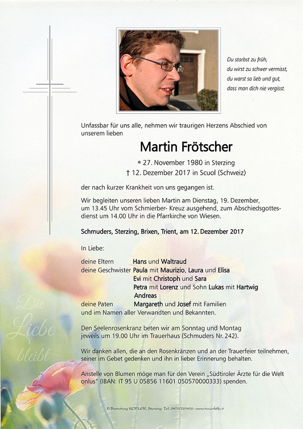 Anstelle von Blumen möge man für den Verein „Südtiroler Ärzte für die Welt onlus” (IBAN: IT 95 U 05856 11601 050570000333) spenden.