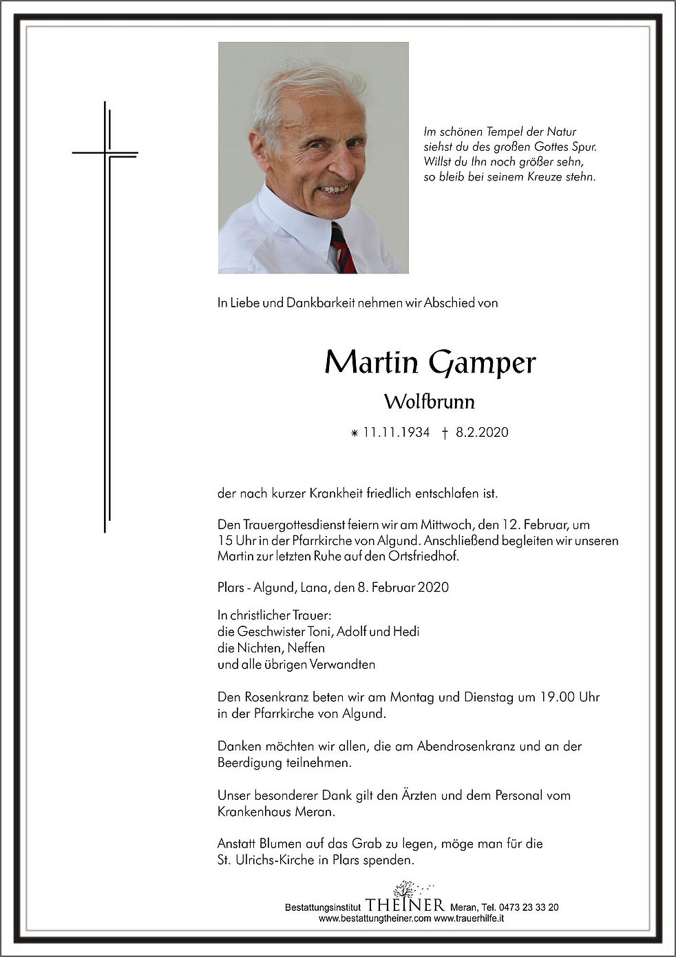 Den Trauergottesdienst feiern wir am Mittwoch, den 12. Februar, um 15 Uhr in der Pfarrkirche von Algund. Anschließend begleiten wir unseren Martin zur letzten Ruhe auf den Ortsfriedhof.