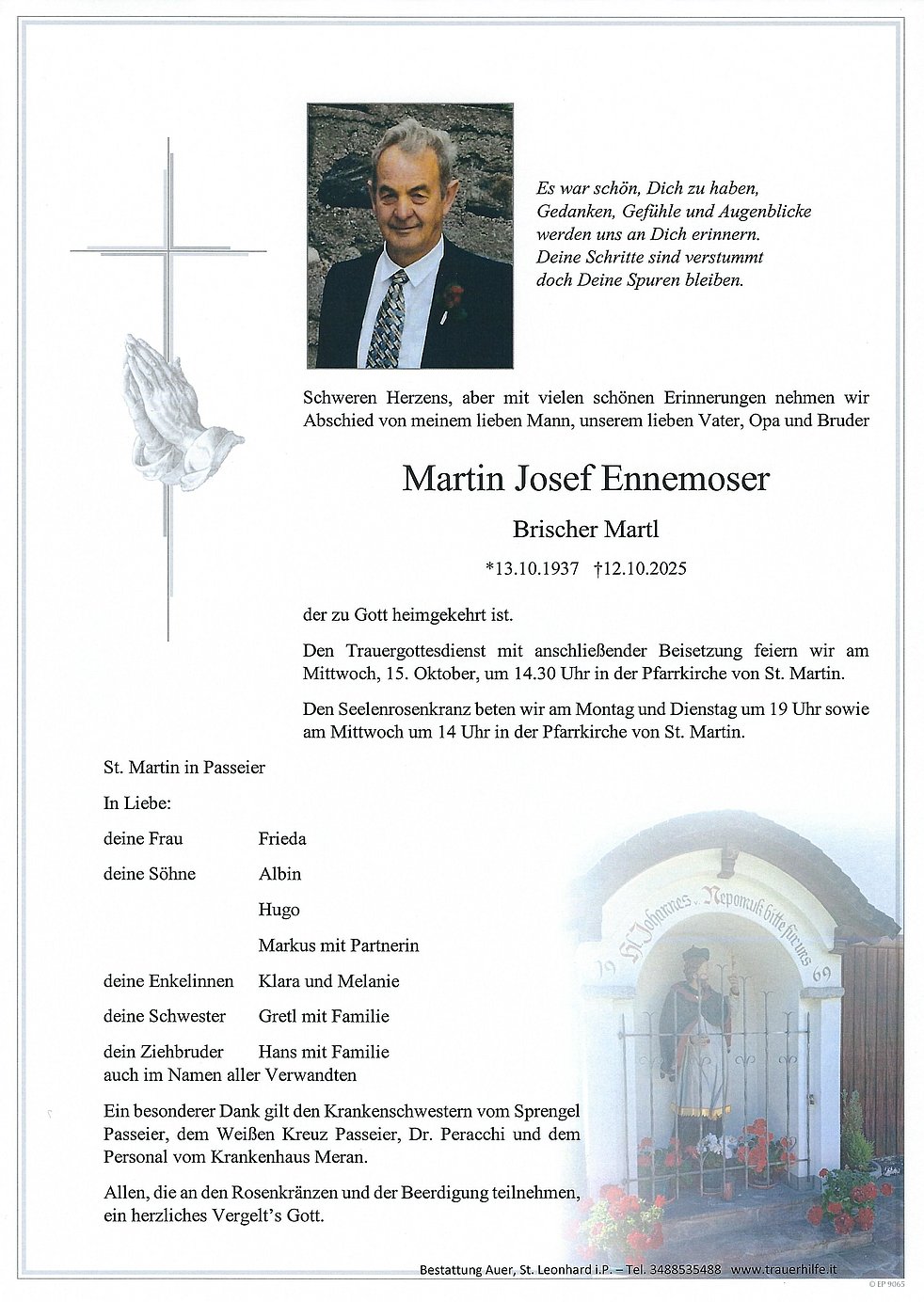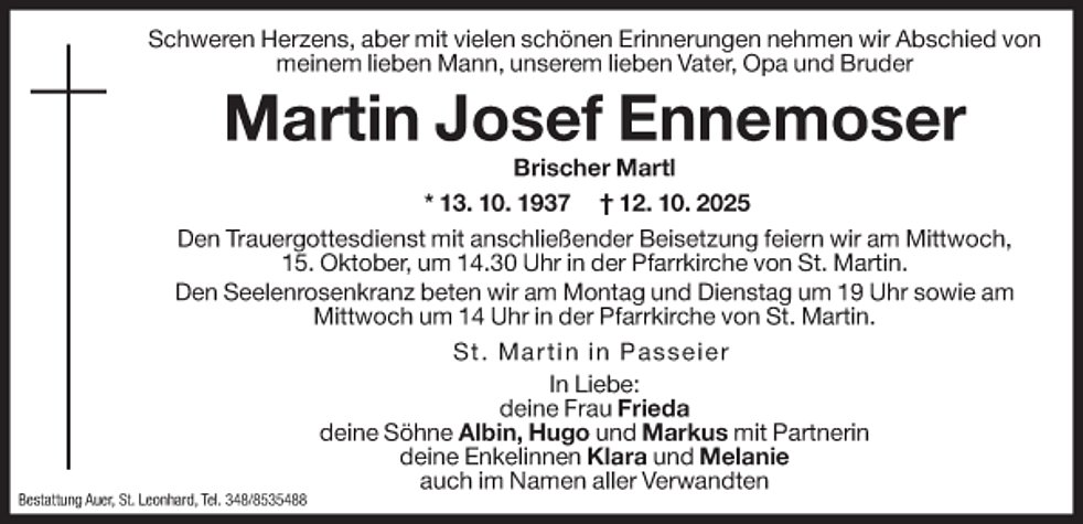 Den Trauergottesdienst mit anschließender Beisetzung feiern wir am Mittwoch, 15. Oktober, um 14.30 Uhr in der Pfarrkirche von St. Martin.