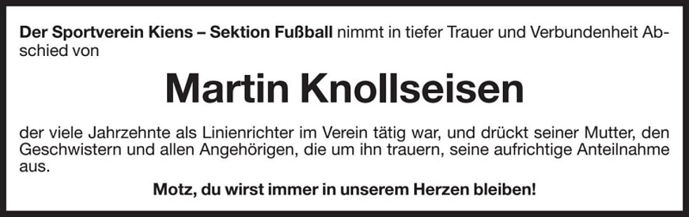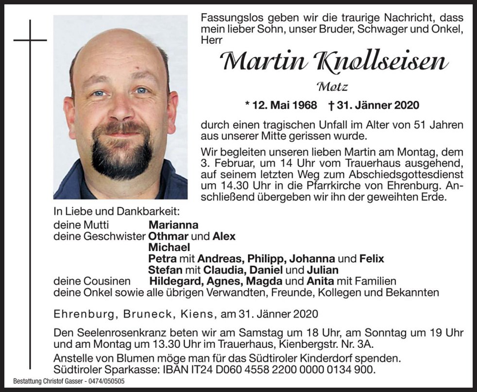 Wir begleiten unseren lieben Martin am Montag, dem 3. Februar, um 14 Uhr vom Trauerhaus ausgehend, auf seinem letzten Weg zum Abschiedsgottesdienst um 14.30 Uhr in die Pfarrkirche von Ehrenburg. Anschließend übergeben wir ihn der geweihten Erde.