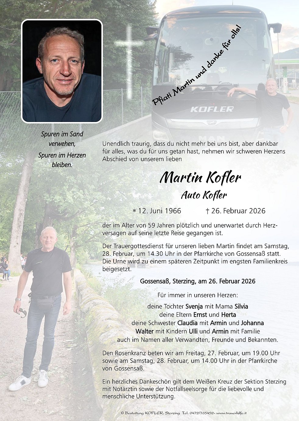 Der Trauergottesdienst für unseren lieben Martin findet am Samstag, 28. Februar, um 14.30 Uhr in der Pfarrkirche von Gossensaß statt. Die Urne wird zu einem späteren Zeitpunkt im engsten Familienkreis beigesetzt.