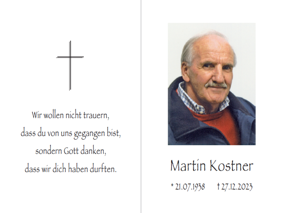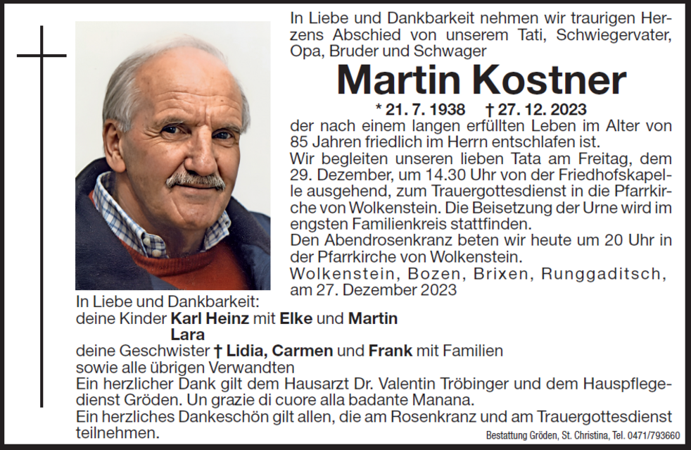 Wir begleiten unseren lieben Tata am Freitag, dem 29. Dezember, um 14.30 Uhr von der Friedhofskapelle ausgehend, zum Trauergottesdienst in die Pfarrkirche von Wolkenstein.