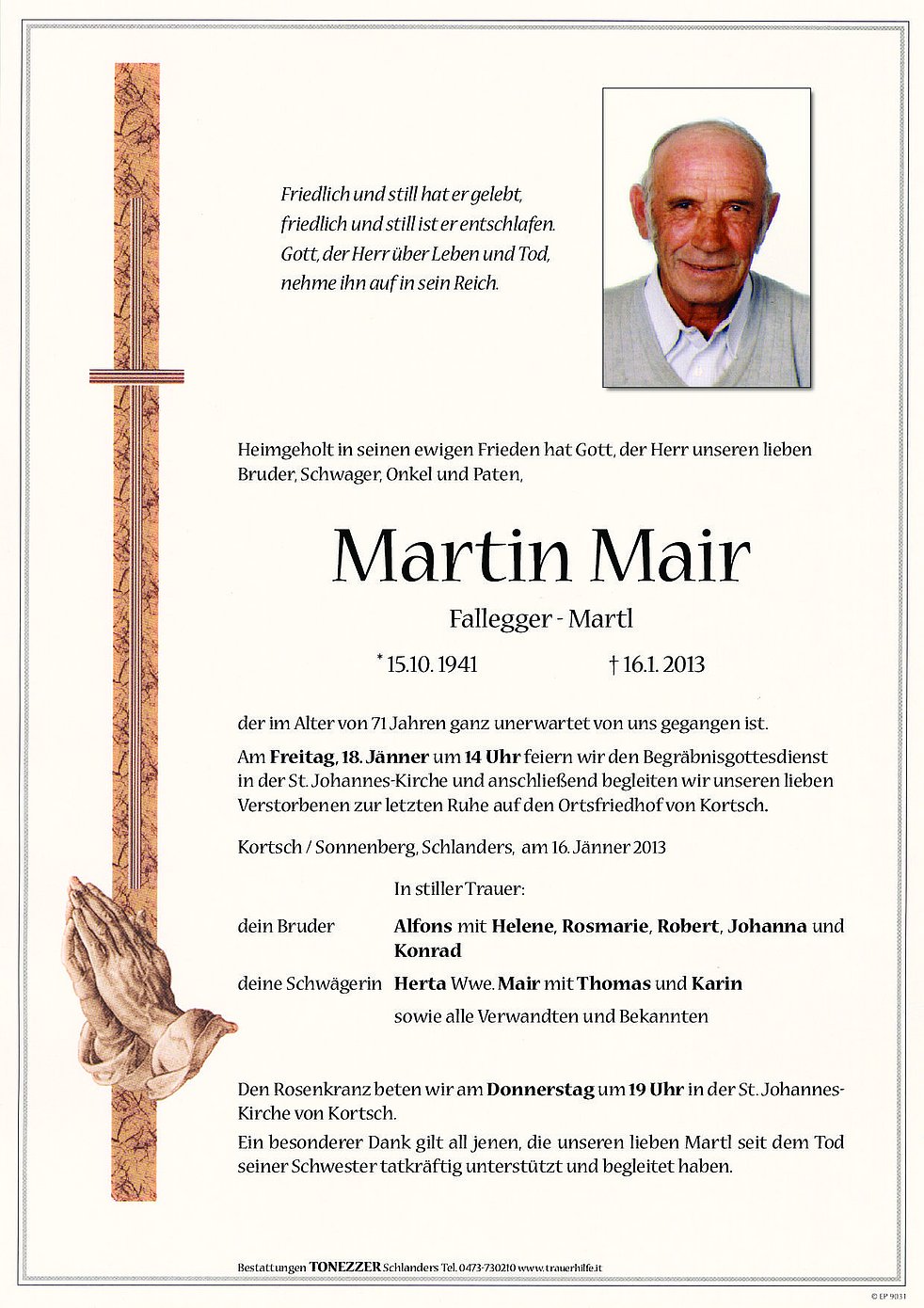 Ein besonderer Dank gilt all jenen, die unseren lieben Martl seit dem Tod seiner Schwester tatkräftig unterstützt und begleitet haben.