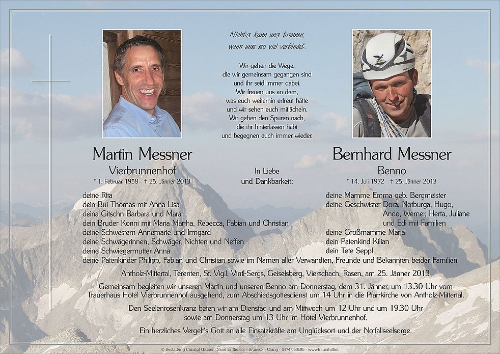 Gemeinsam begleiten wir unseren Martin und unseren Benno am Donnerstag, dem 31. Jänner, um 13.30 Uhr vom Trauerhaus Hotel Vierbrunnenhof ausgehend, zum Abschiedsgottesdienst um 14 Uhr in die Pfarrkirche von Antholz-Mittertal.