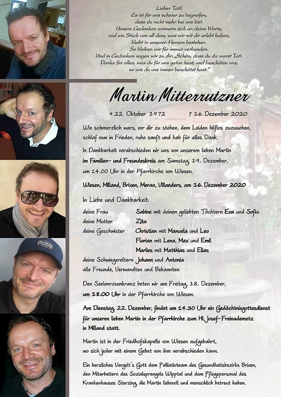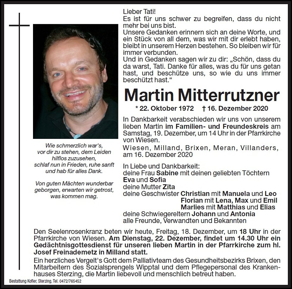 Am Dienstag, 22. Dezember, findet um 14.30 Uhr ein Gedächtnisgottesdienst für unseren lieben Martin in der Pfarrkirche zum Hl. Josef- Freinademetz in Milland statt.