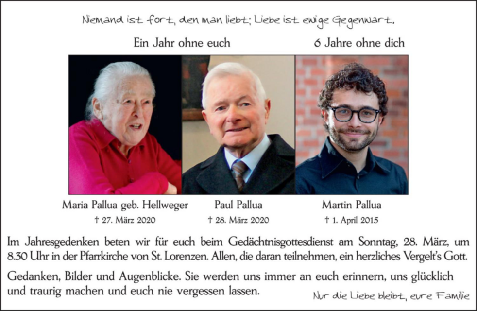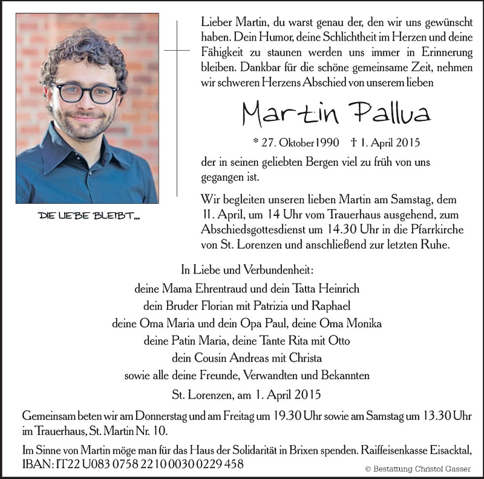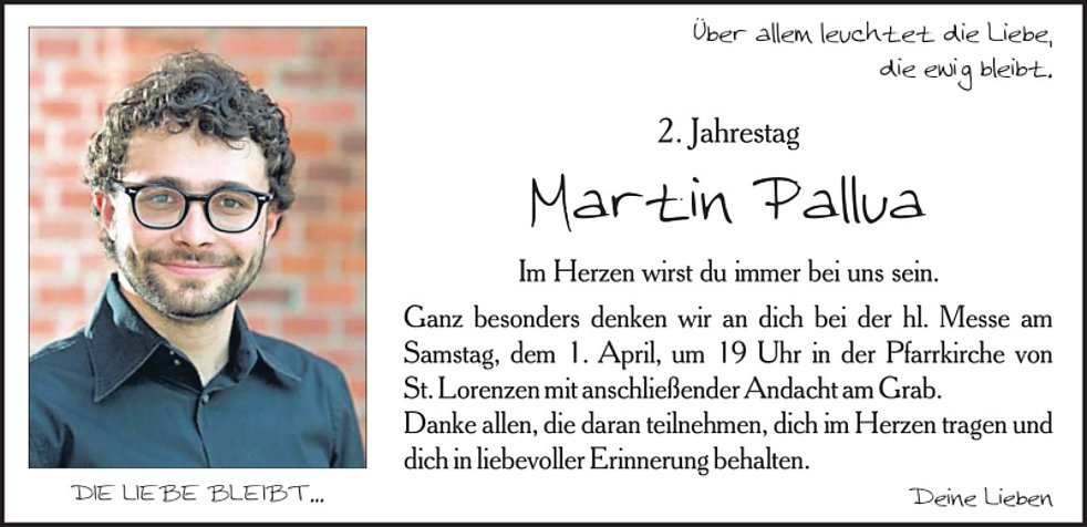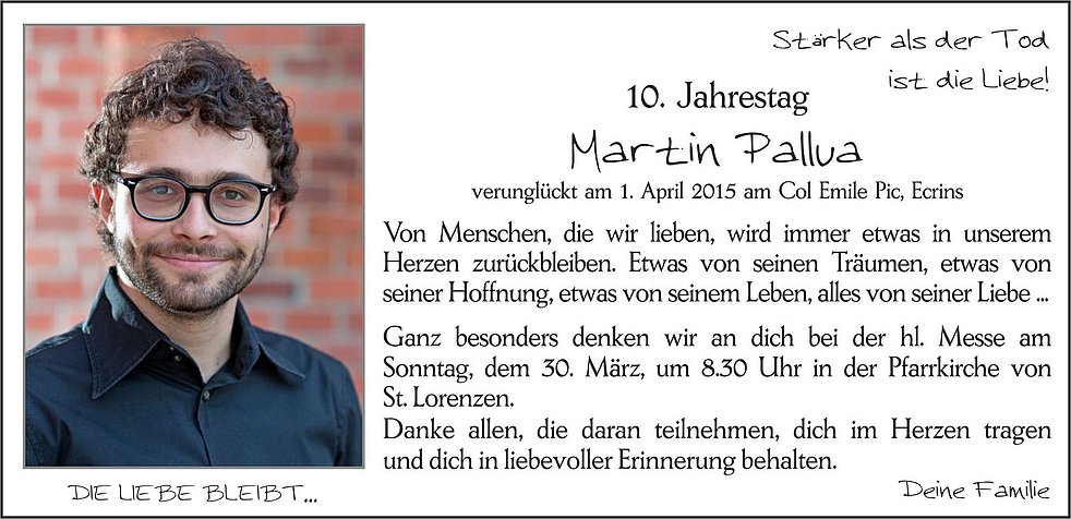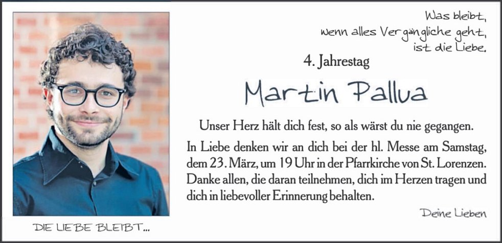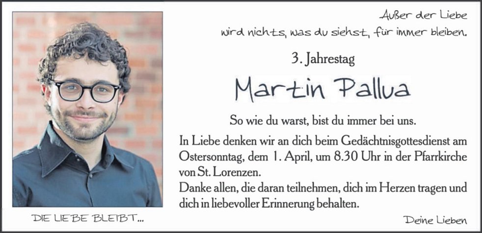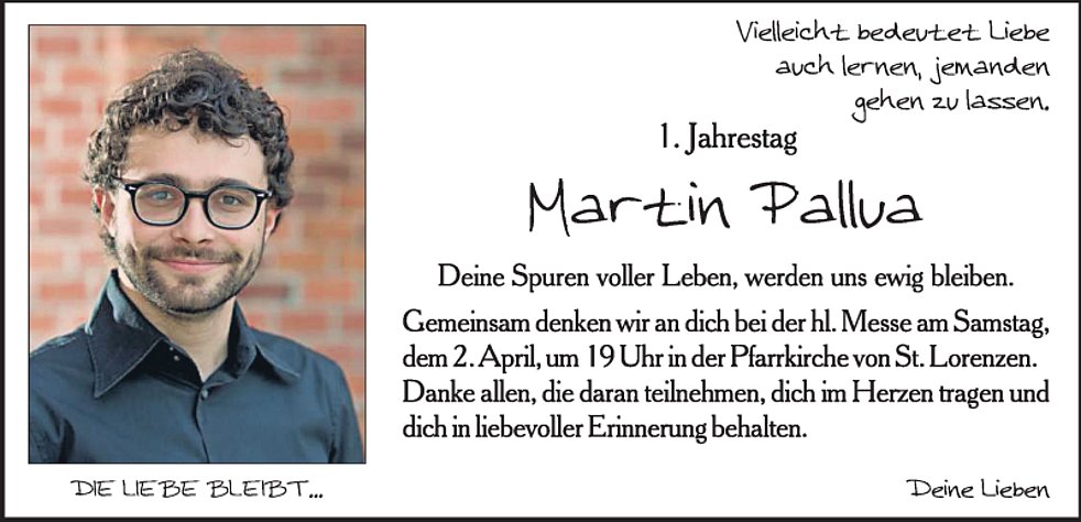 Wir begleiten unseren lieben Martin am Samstag, dem 11. April, um 14 Uhr vom Trauerhaus ausgehend, zum Abschiedsgottesdienst um 14.30 Uhr in die Pfarrkirche von St. Lorenzen und anschließend zur letzten Ruhe.