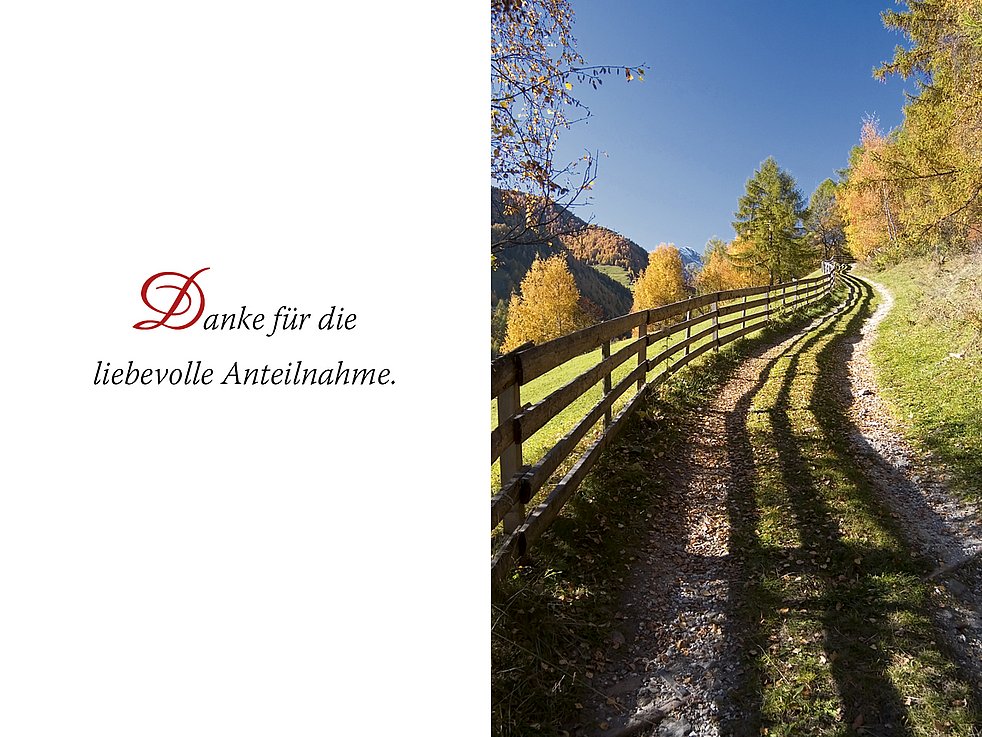 Wir danken dem Hausarzt Dr. Christoph Erler, Frau Dr. Kathrin Gapp der Palliativmedizin und den Pflegerinnen Marina, Evi und Christine des Gesundheitssprengels Überetsch für die liebevolle Betreuung.