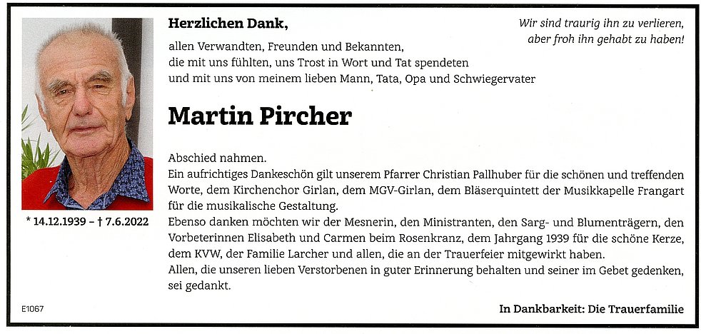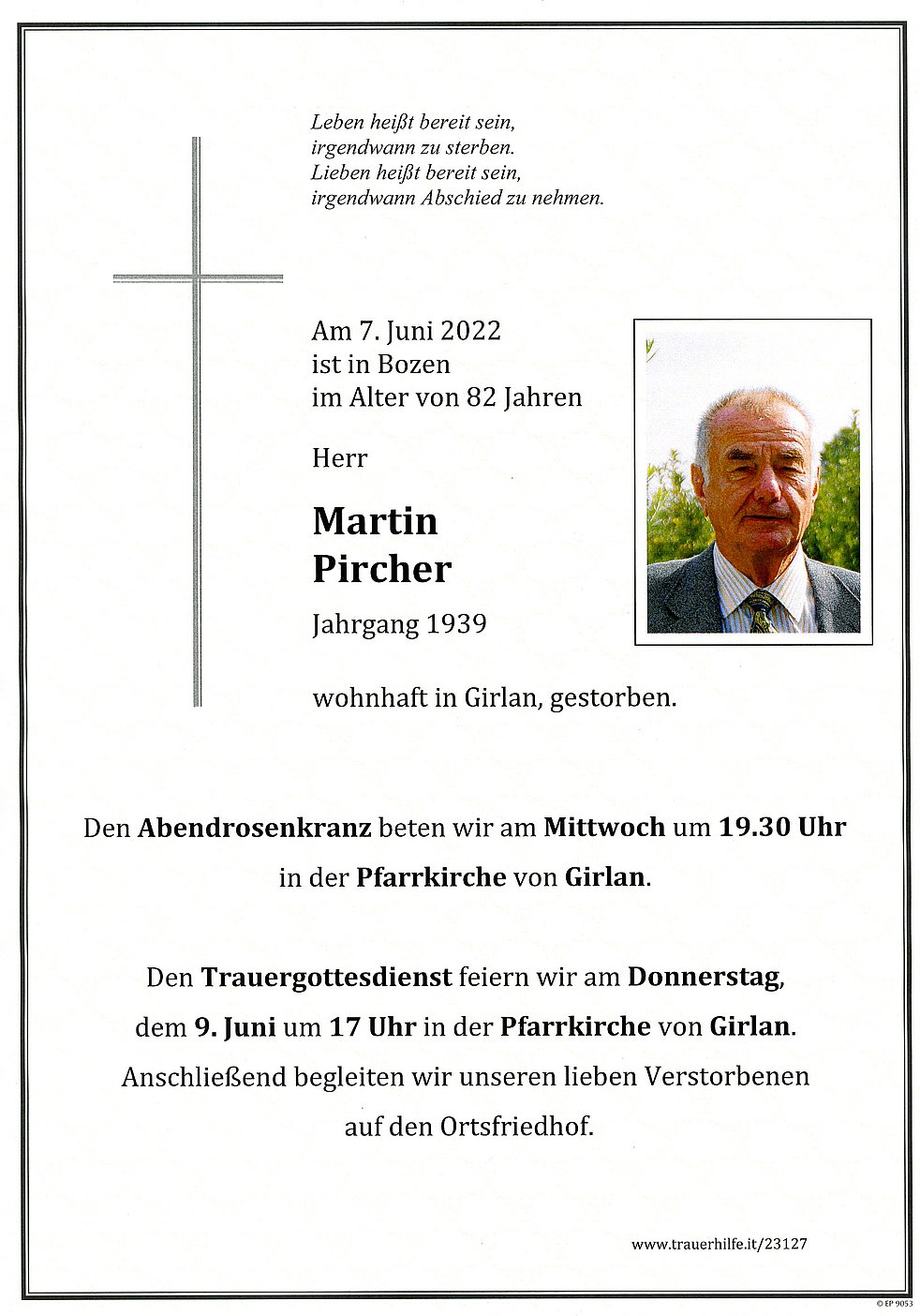 Den Trauergottesdienst feiern wir am Donnerstag, dem 9. Juni um 17 Uhr in der Pfarrkirche von Girlan. Anschließend begleiten wir unseren lieben Verstorbenen auf den Ortsfriedhof.