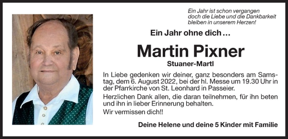 Den Trauergottesdienst mit anschließender Beisetzung feiern wir am Montag, 9. August, um 9 Uhr in der Pfarrkirche von St. Leonhard.