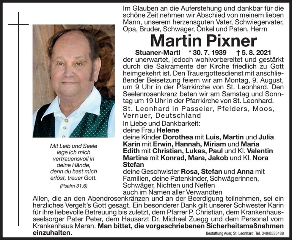 Ein besonderer Dank gilt unserer Schwester Karin für ihre liebevolle Betreuung bis zuletzt, dem Pfarrer P. Christian, dem Krankenhausseelsorger Pater Peter, dem Hausarzt Dr. Michael Zuegg und dem Personal vom Krankenhaus Meran.