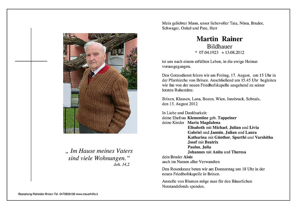 Gedankt sei den Ärzten und dem Pflegepersonal der Abteilung Medizin I des Brixner Krankenhauses sowie Frau Dr. Marlene Kerer für die liebevolle Betreuung und allen, die am Rosenkranz und an der Beerdigung teilnehmen und ihn ins Gebet einschließen.
