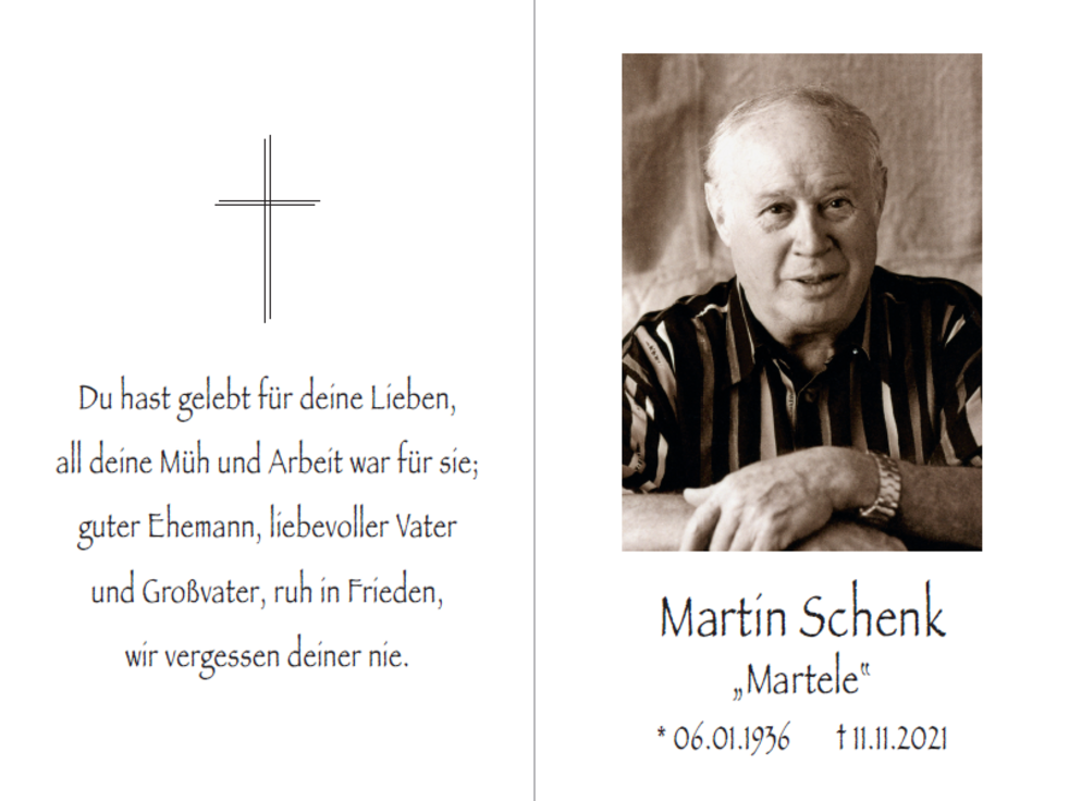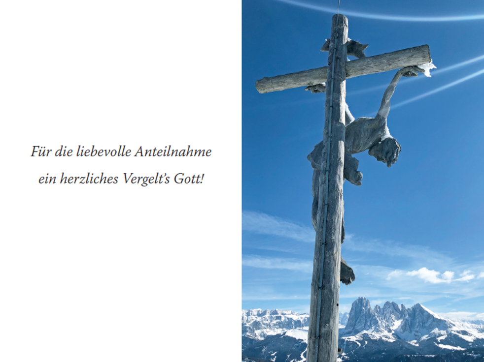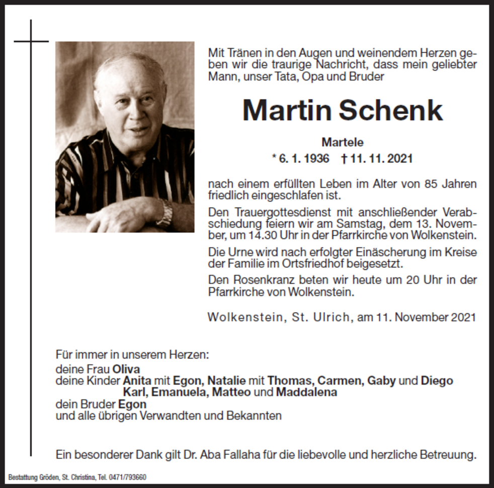 Den Trauergottesdienst mit anschließender Verabschiedung feiern wir am Samstag, dem 13. November, um 14.30 Uhr in der Pfarrkirche von Wolkenstein. Die Urne wird nach erfolgter Einäscherung im Kreise der Familie im Ortsfriedhof beigesetzt.