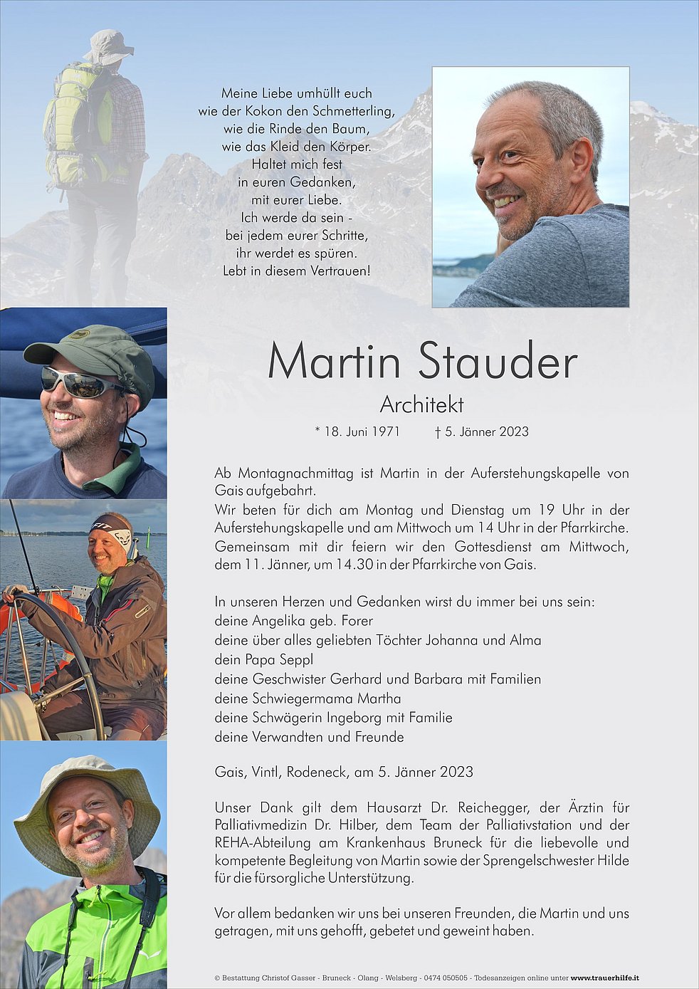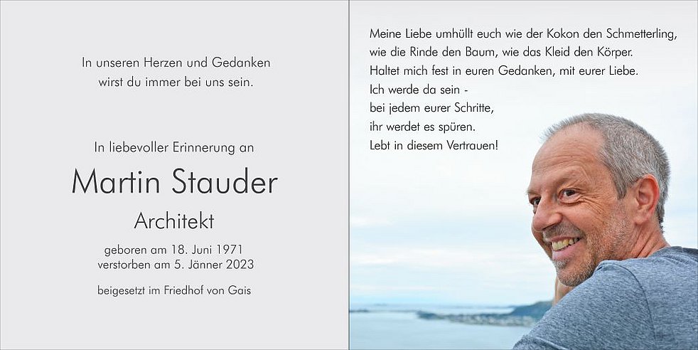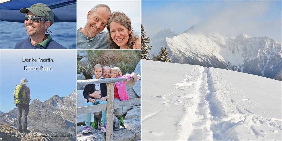 Unser Dank gilt dem Hausarzt Dr. Reichegger, der Ärztin für Palliativmedizin Dr. Hilber, dem Team der Palliativstation und der REHA-Abteilung am Krankenhaus Bruneck für die liebevolle und kompetente Begleitung von Martin sowie der Sprengelschwester Hilde für die fürsorgliche Unterstützung.