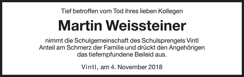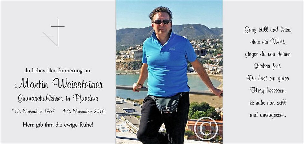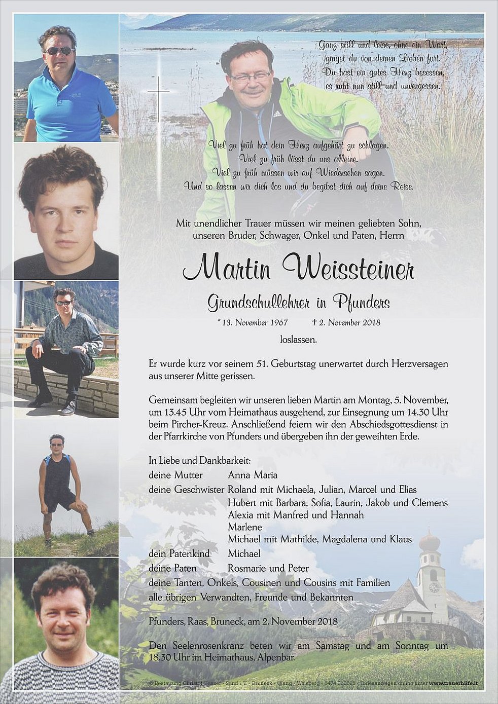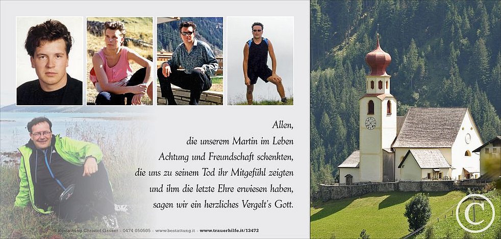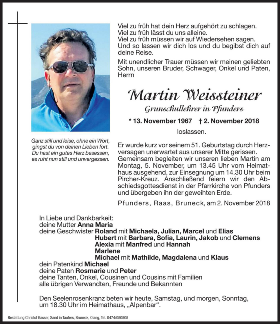 Gemeinsam begleiten wir unseren lieben Martin am Montag, 5. November, um 13.45 Uhr vom Heimathaus ausgehend, zur Einsegnung um 14.30 Uhr beim Pircher-Kreuz. Anschließend feiern wir den Abschiedsgottesdienst in der Pfarrkirche von Pfunders und übergeben ihn der geweihten Erde.
