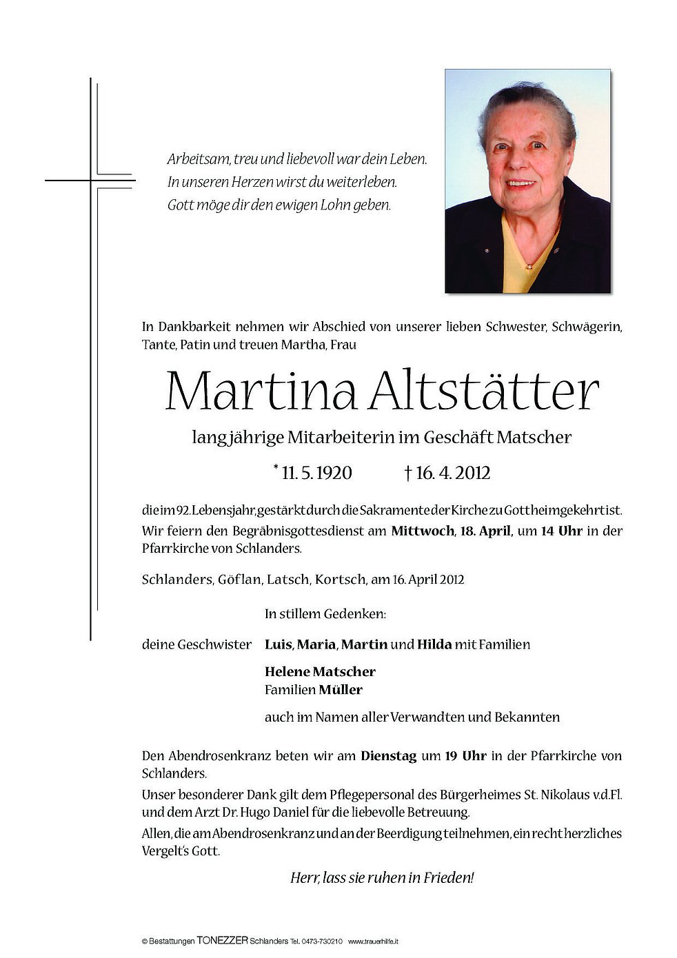 In Dankbarkeit nehmen wir Abschied von unserer lieben Schwester, Schwägerin, Tante, Patin und treuen Martha, Frau