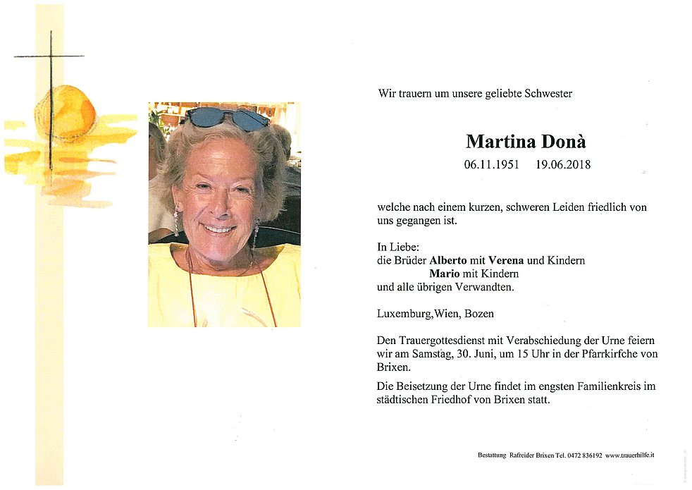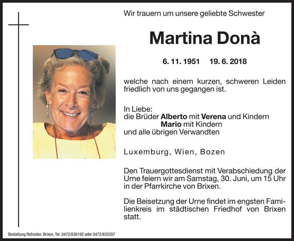 Den Trauergottesdienst mit Verabschiedung der Urne feiern wir am Samstag, 30. Juni, um 15 Uhr in der Pfarrkirche von Brixen.