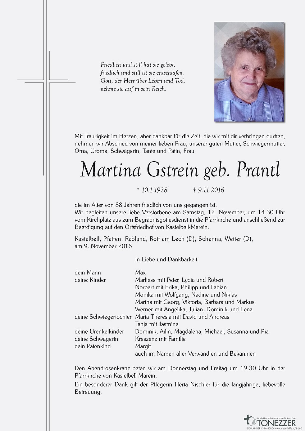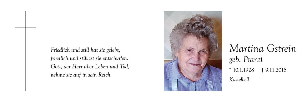 Wir begleiten unsere liebe Verstorbene am Samstag, 12. November, um 14.30 Uhr vom Kirchplatz aus zum Begräbnisgottesdienst in die Pfarrkirche und anschließend zur Beerdigung auf den Ortsfriedhof von Kastelbell-Marein.