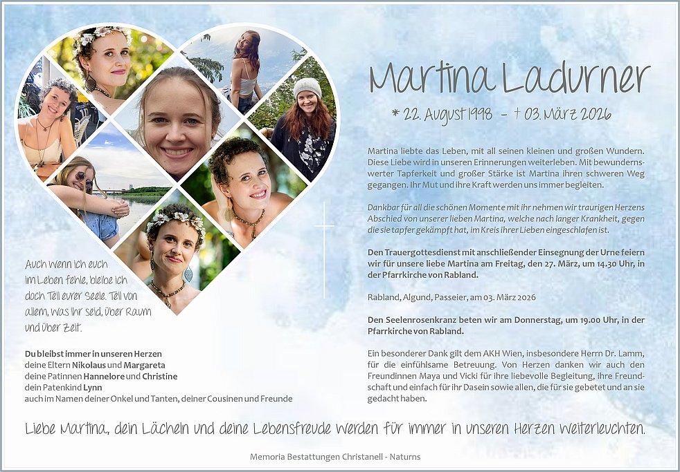 Den Trauergottesdienst mit anschließender Einsegnung der Urne feiern wir für unsere liebe Martina am Freitag, den 27. März, um 14.30 Uhr, in der Pfarrkirche von Rabland.