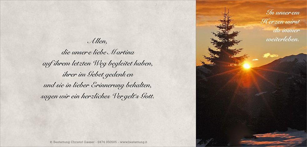 Wir begleiten unsere liebe Martina am Freitag, dem 19. Februar, von der Friedhofskapelle ausgehend, zum Gottesdienst um 15 Uhr in die Pfarrkirche von Terenten.