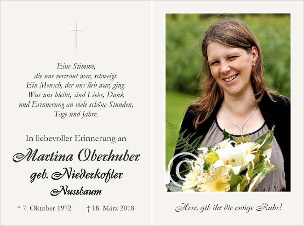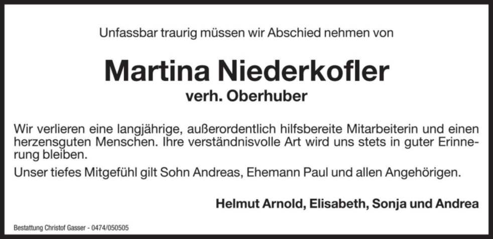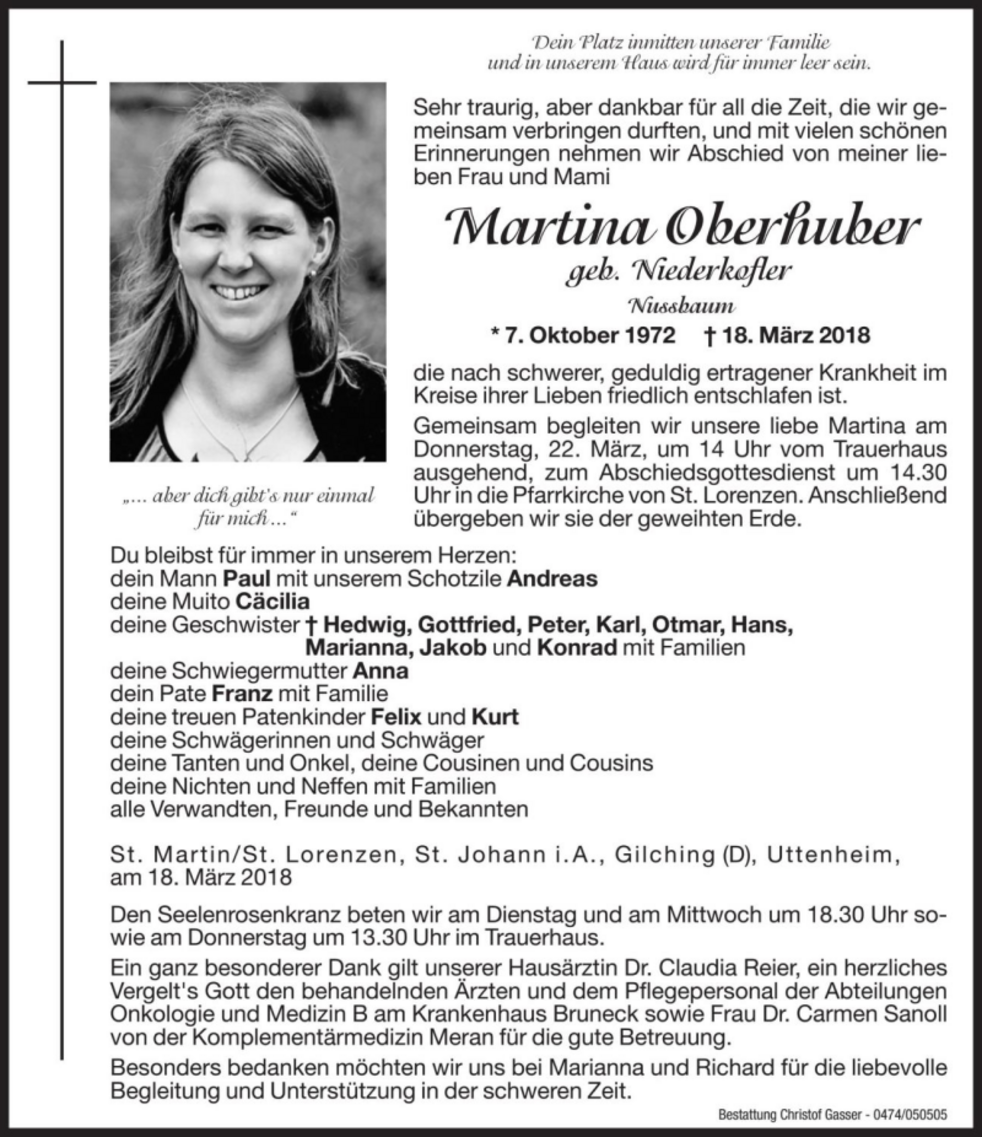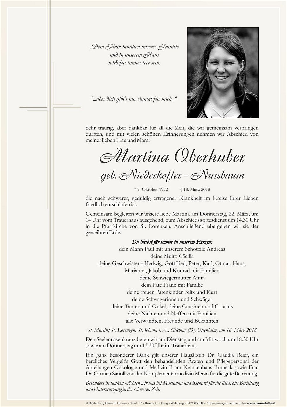 Gemeinsam begleiten wir unsere liebe Martina am Donnerstag, 22. März, um 14 Uhr vom Trauerhaus ausgehend, zum Abschiedsgottesdienst um 14.30 Uhr in die Pfarrkirche von St. Lorenzen. Anschließend übergeben wir sie der geweihten Erde.