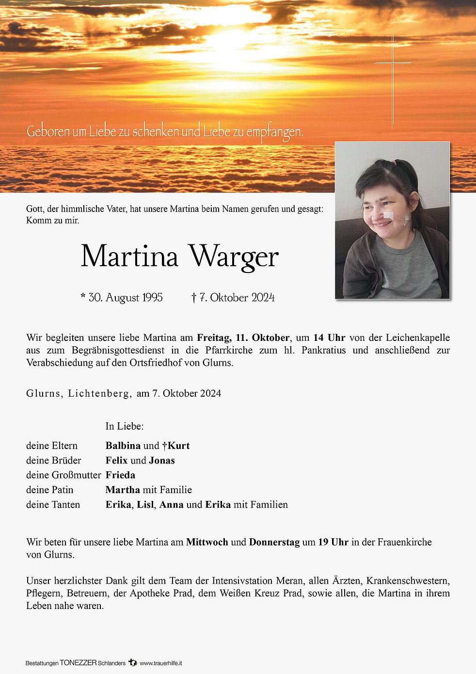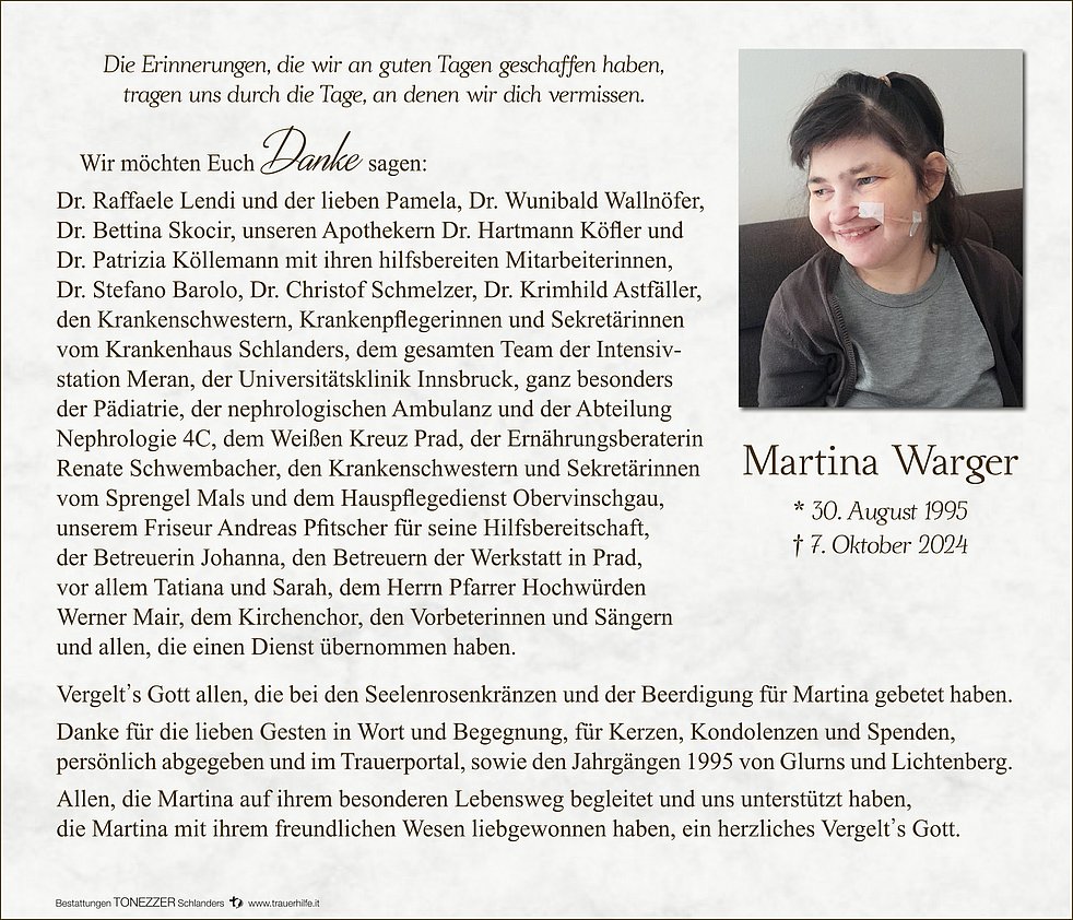 im Namen der Schulgemeinschaft des Oberschulzentrums Mals und auch persönlich drücke ich euch das Beileid aus. Wir wünschen euch Kraft und Zuversicht in der Zeit des Abschieds.