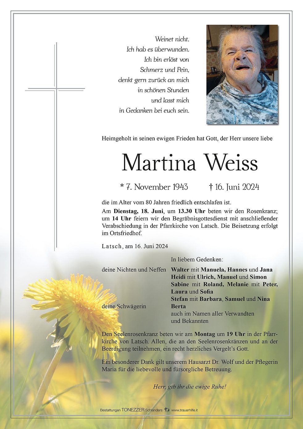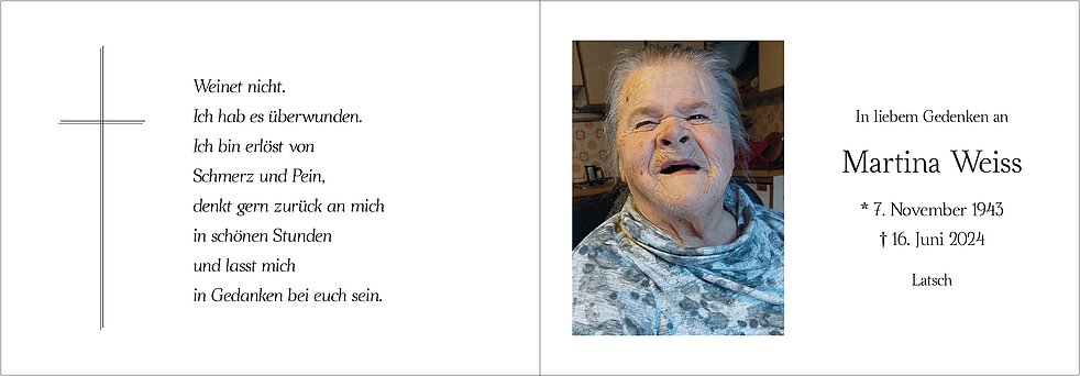 Liebe Trauerfamilie ihr seid immer für eure Martina dagewesen unser Herrgott möge es euch lohnen. Ich möchte euch mein aufrichtiges Beileid aussprechen.