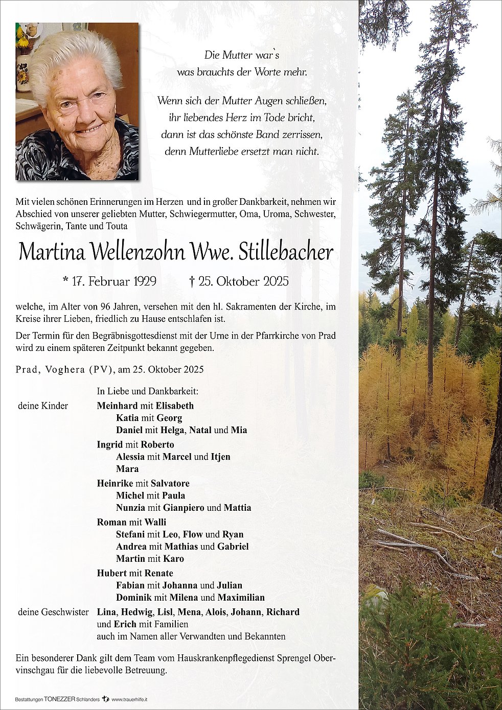 welche, im Alter von 96 Jahren, versehen mit den hl. Sakramenten der Kirche, im Kreise ihrer Lieben, friedlich zu Hause entschlafen ist.