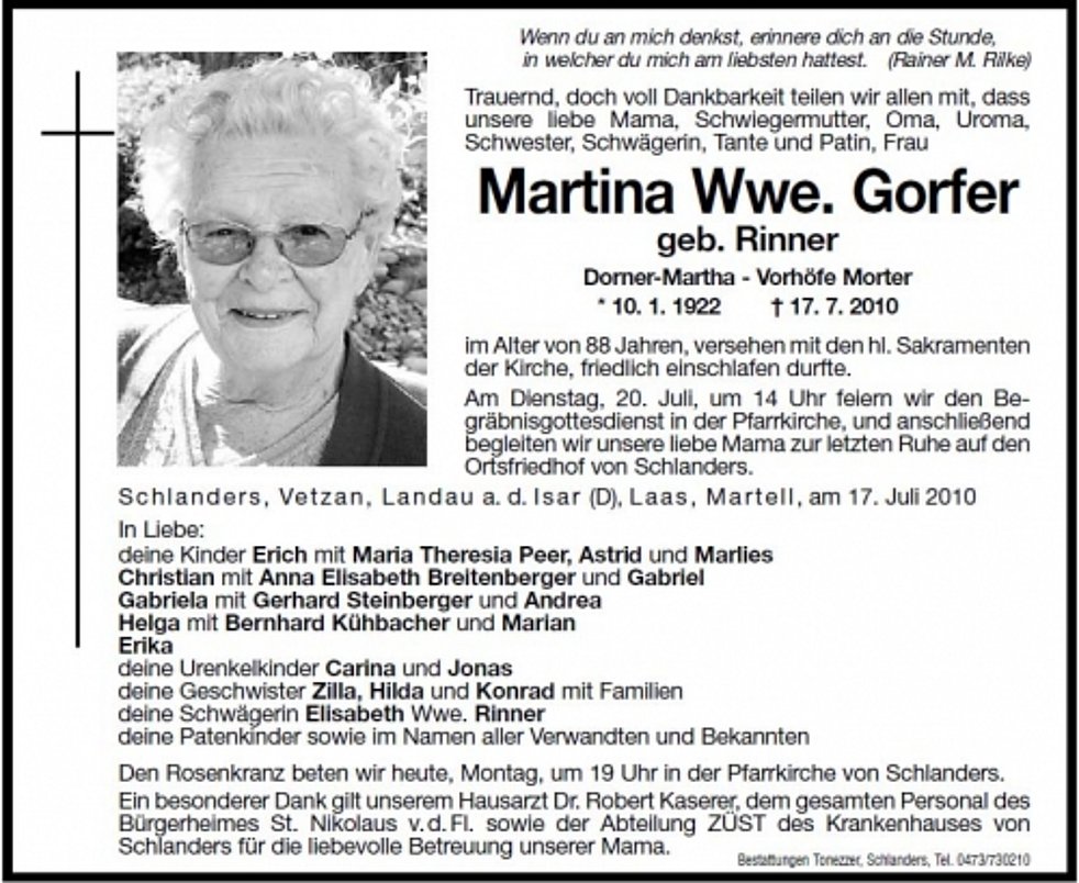 Ein besonderer Dank gilt unserem Hausarzt Dr. Robert Kaserer, mit gesamten Personal des Bürgerheimes St. Nikolaus v.d.Fl. sowie der Abteilung ZÜST des Krankenhauses von Schlanders für die liebevolle Betreuung unserer Mama.