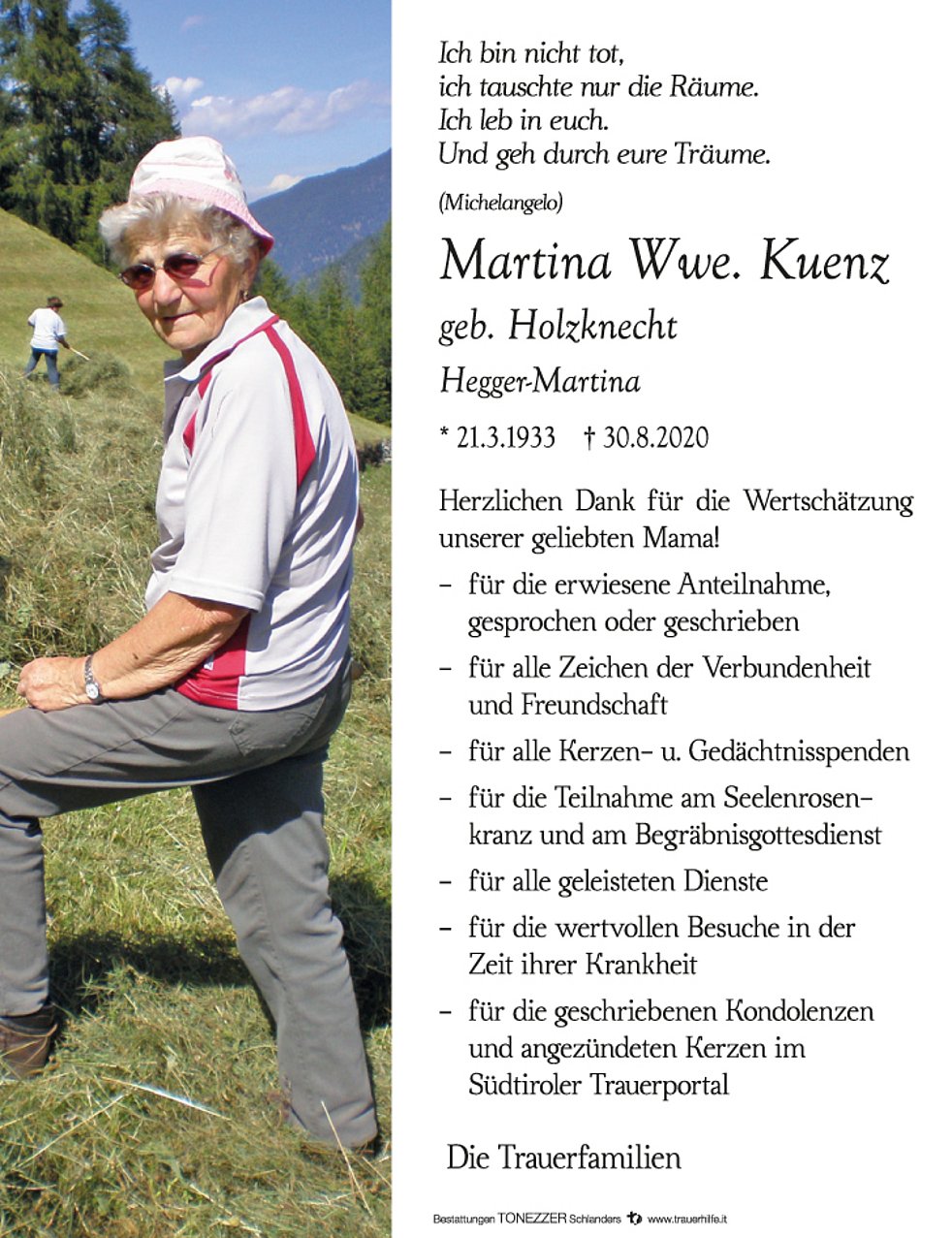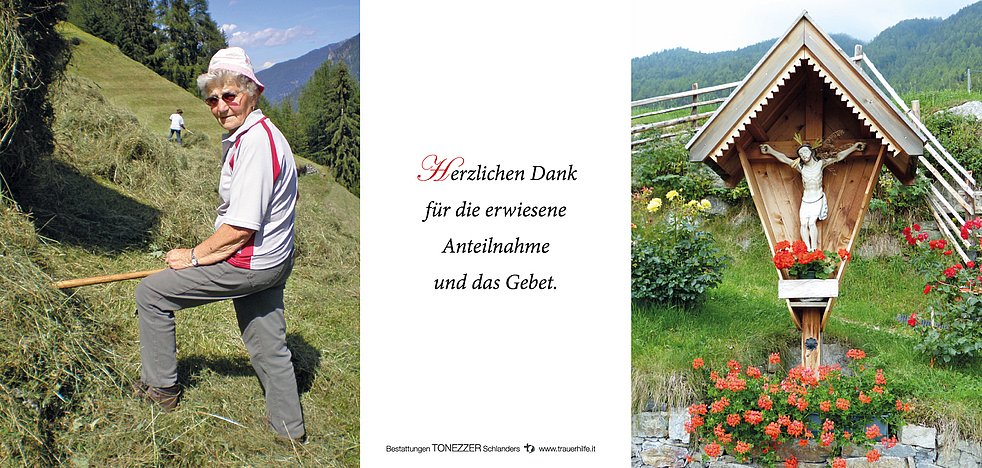 Ein besonderer Dank gilt dem Haus- und Krankenpflegedienst des Sprengels Mittelvinschgau, dem Hausarzt Dr. Paul Rechenmacher, dem Team der Abteilung Medizin des Krankenhauses von Schlanders sowie den Betreuerinnen für die liebevolle Unterstützung.