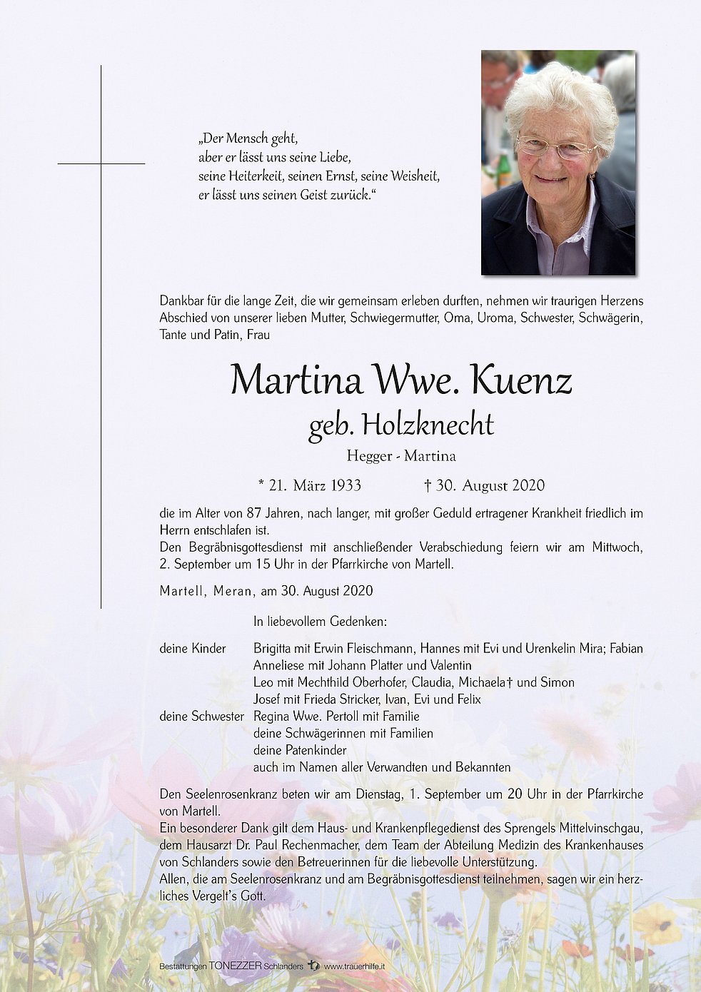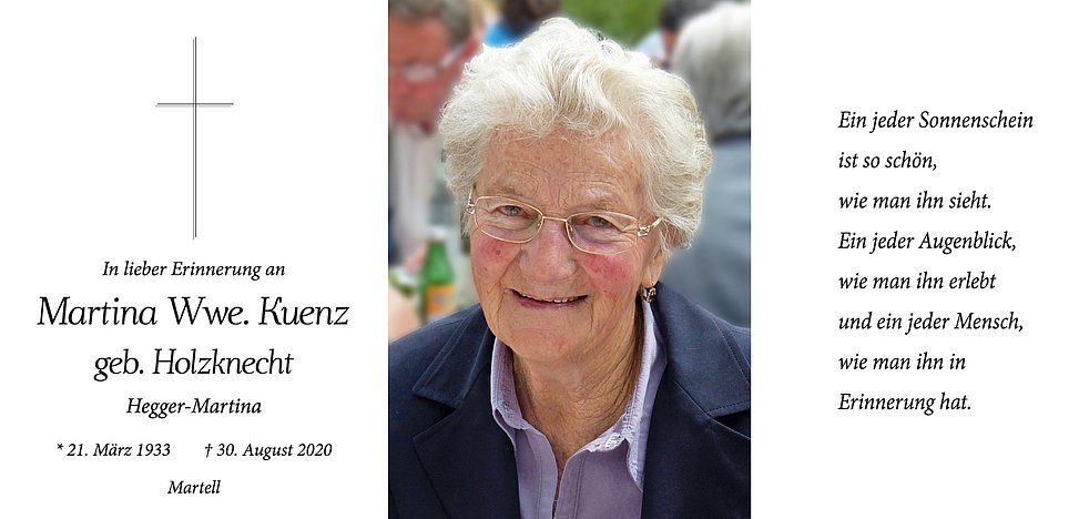 Den Begräbnisgottesdienst mit anschließender Verabschiedung feiern wir am Mittwoch, 2. September um 15 Uhr in der Pfarrkirche von Martell.