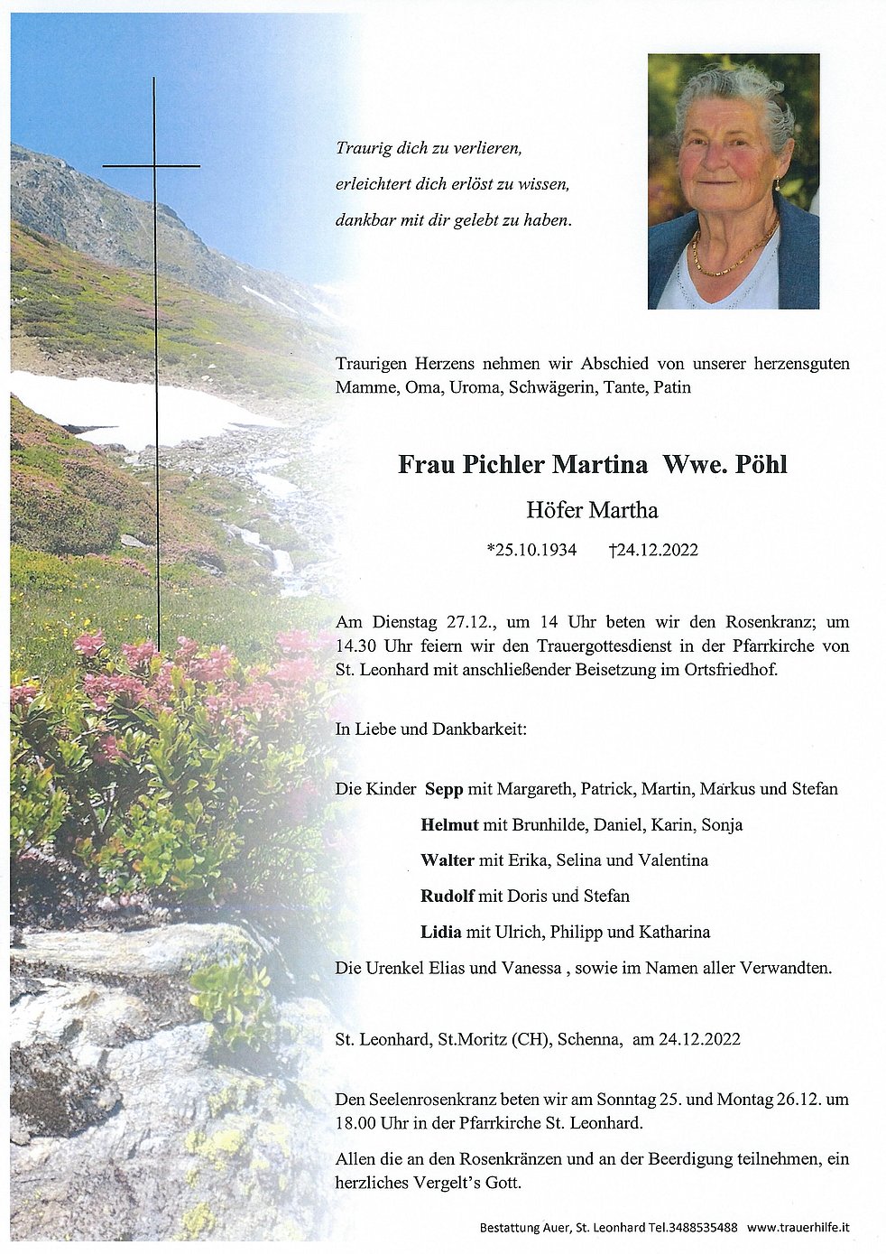 Am Dienstag 27.12., um 14 Uhr beten wir den Rosenkranz; um 14.30 Uhr feiern wir den Trauergottesdienst in der Pfarrkirche von St. Leonhard mit anschließender Beisetzung im Ortsfriedhof.
