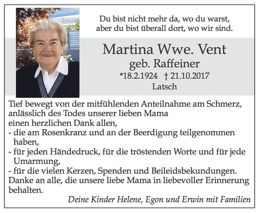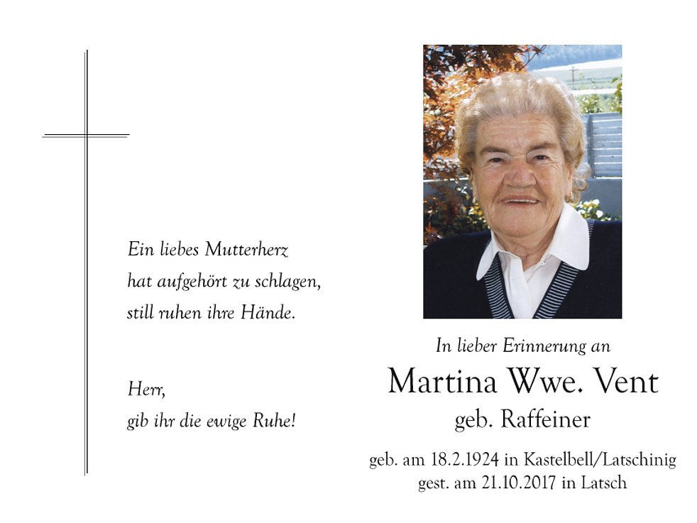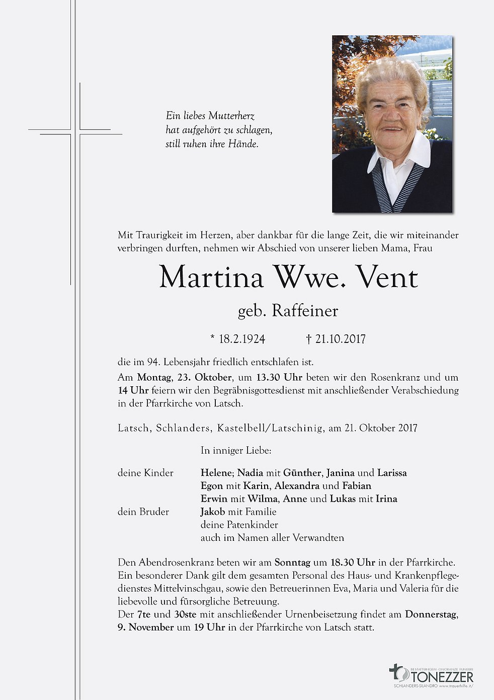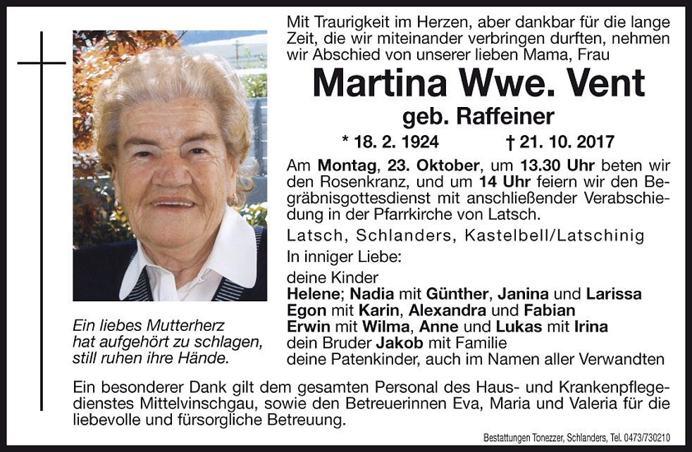 Der 7te und 30ste mit anschließender Urnenbeisetzung findet am Donnerstag, 9. November um 19 Uhr in der Pfarrkirche von Latsch statt.
