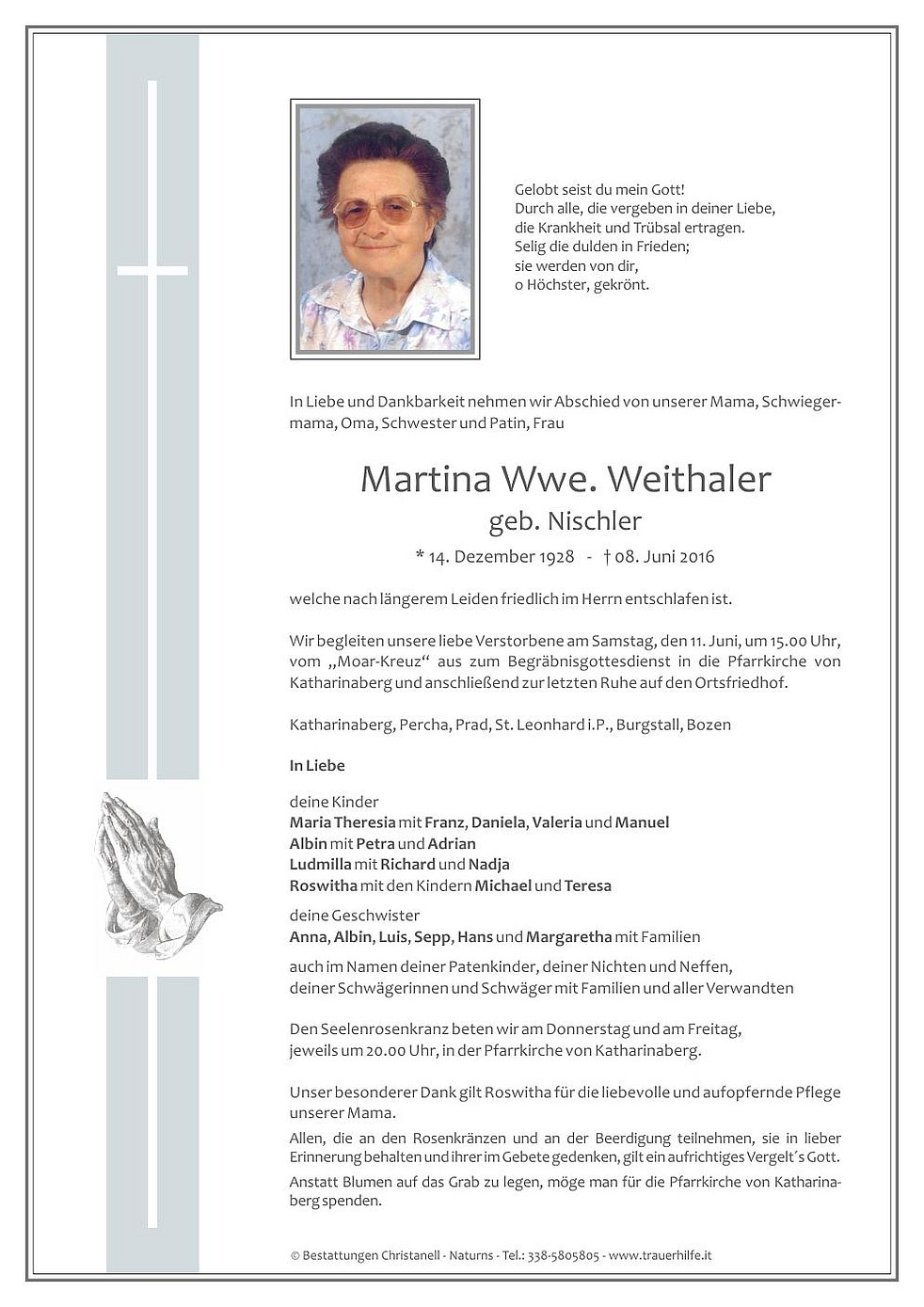 Wir begleiten unsere liebe Verstorbene am Samstag, den 11. Juni, um 15.00 Uhr, vom „Moar-Kreuz“ aus zum Begräbnisgottesdienst in die Pfarrkirche von Katharinaberg und anschließend zur letzten Ruhe auf den Ortsfriedhof.