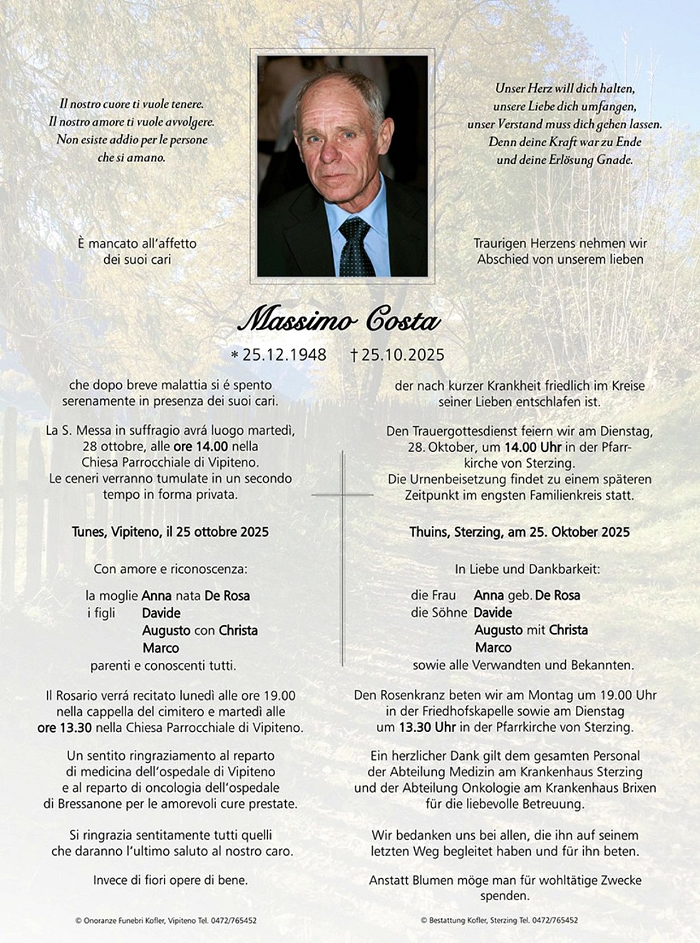 Den Trauergottesdienst feiern wir am Dienstag, 28. Oktober, um 14.00 Uhr in der Pfarrkirche von Sterzing. Die Urnenbeisetzung findet zu einem späteren Zeitpunkt im engsten Familienkreis statt.