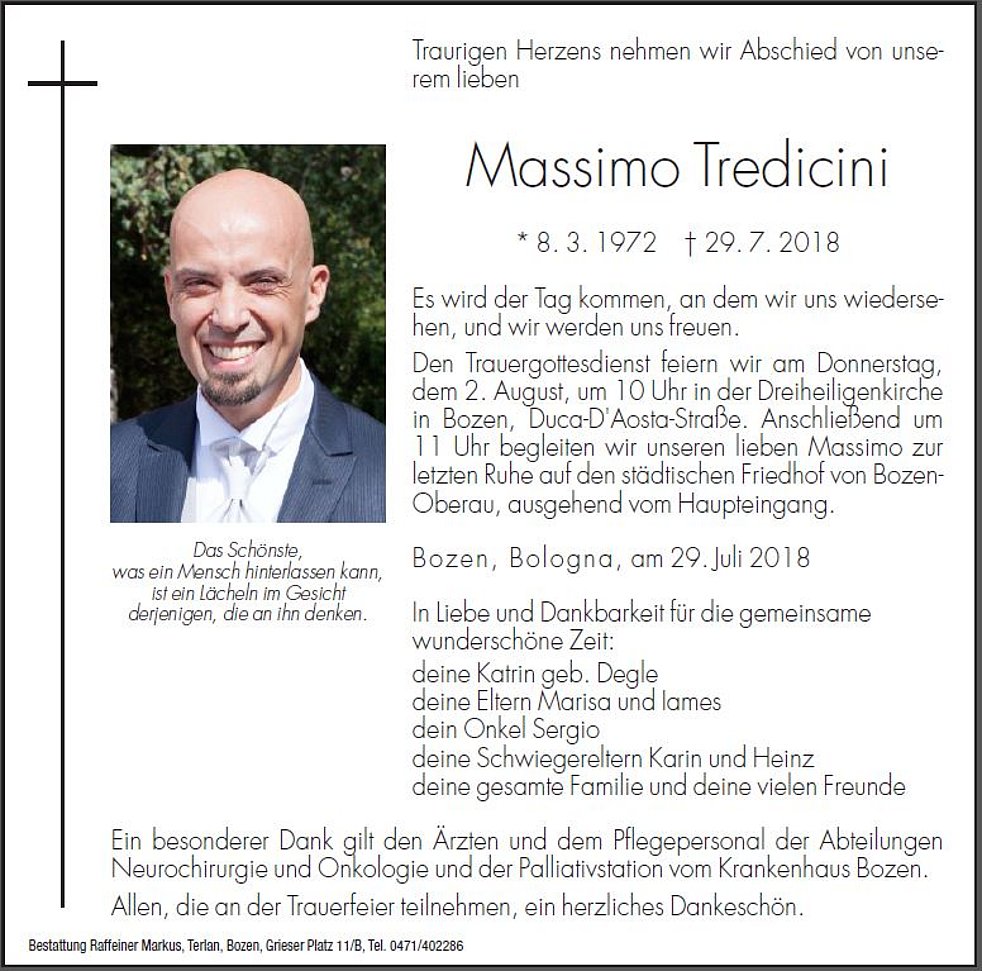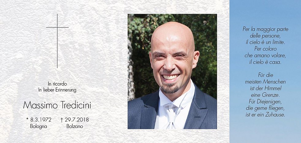 Den Trauergottesdienst feiern wir am Donnerstag, dem 2. August, um 10 Uhr in der Dreiheiligenkirche in Bozen, Duca D`Aosta Straße. Anschließend um 11 Uhr begleiten wir unseren lieben Massimo zur letzten Ruhe auf den städtischen Friedhof von Bozen Oberau, ausgehend vom Haupteingang.