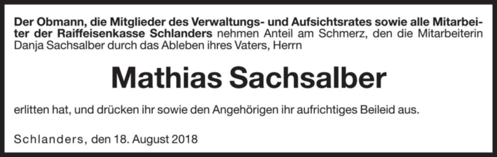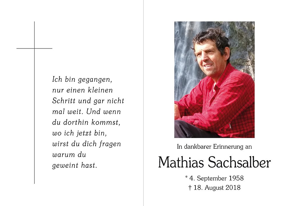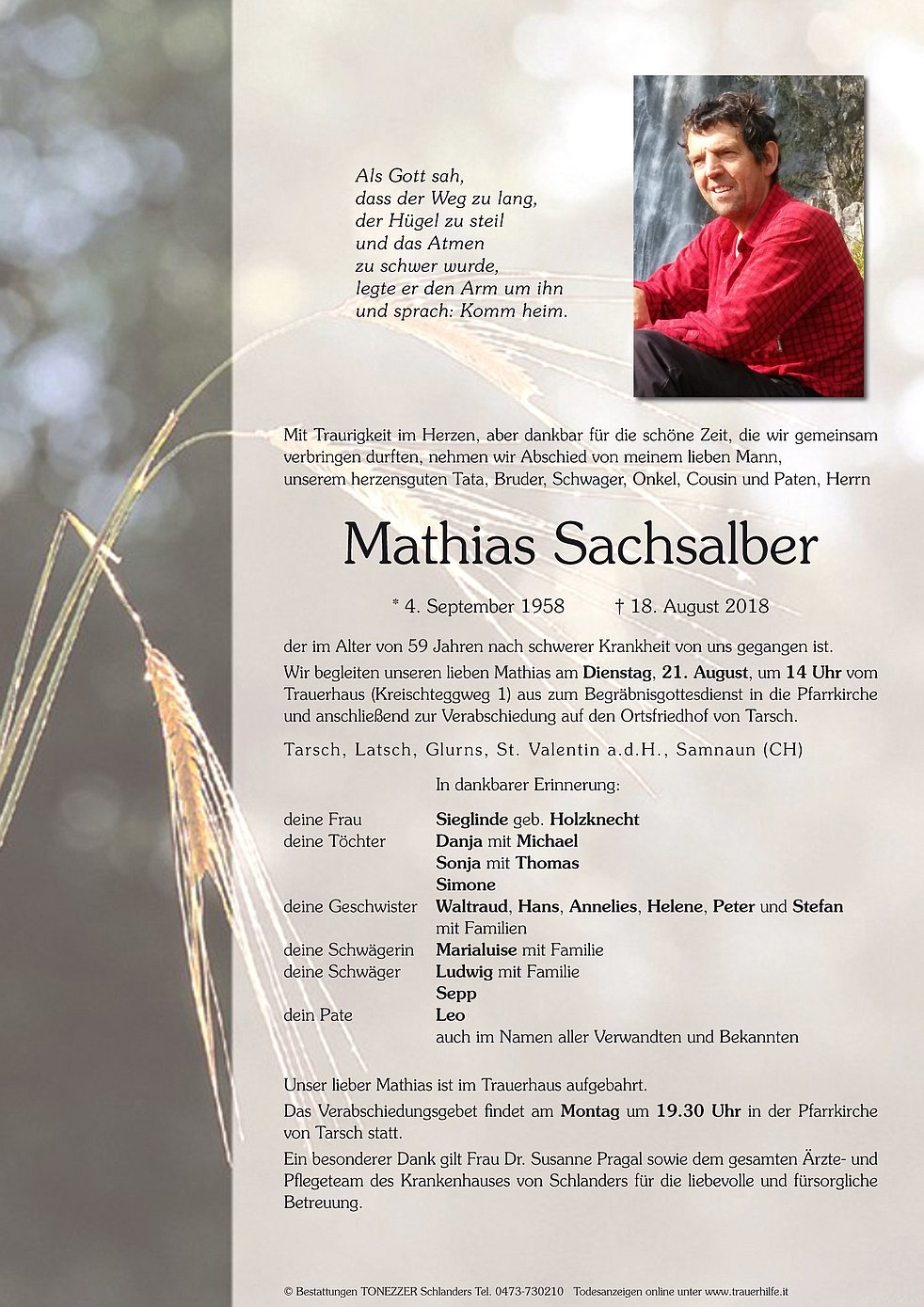Wir begleiten unseren lieben Mathias am Dienstag, 21. August, um 14 Uhr vom Trauerhaus (Kreischteggweg 1) aus zum Begräbnisgottesdienst in die Pfarrkirche und anschließend zur Verabschiedung auf den Ortsfriedhof von Tarsch.