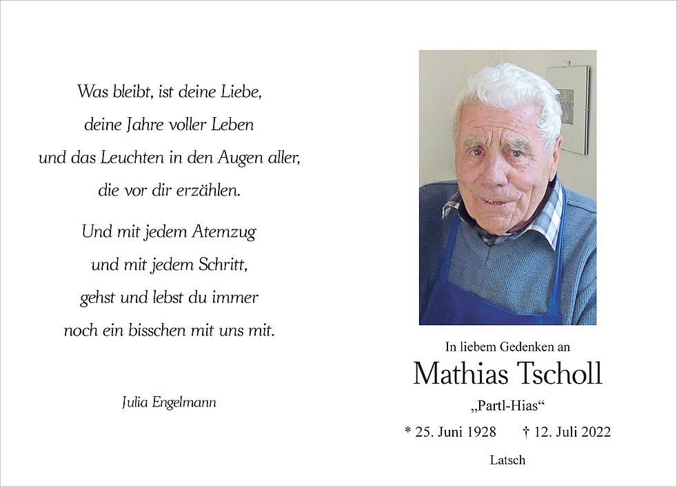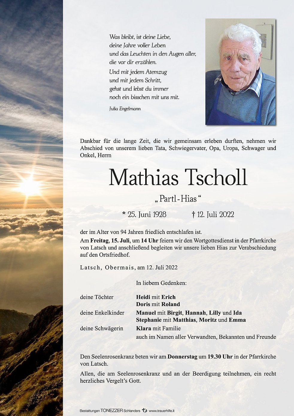 Am Freitag, 15. Juli, um 14 Uhr feiern wir den Wortgottesdienst in der Pfarrkirche von Latsch und anschließend begleiten wir unsere lieben Hias zur Verabschiedung auf den Ortsfriedhof.