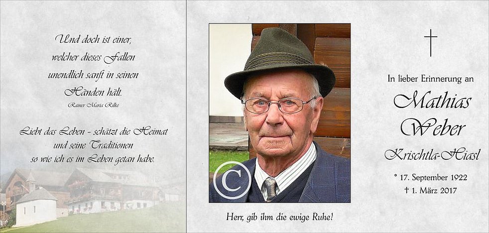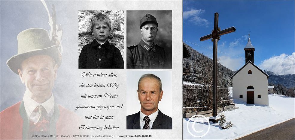 Wir begleiten unseren lieben Vouto am Samstag, dem 4. März, um 13 Uhr vom Heimathaus ausgehend, zum Abschiedsgottesdienst um 14 Uhr in die Pfarrkirche von Pichl-Gsies und anschließend zur letzten Ruhe.