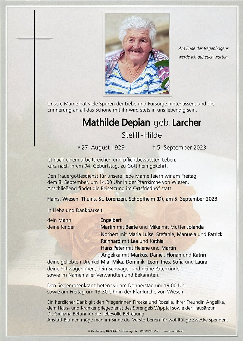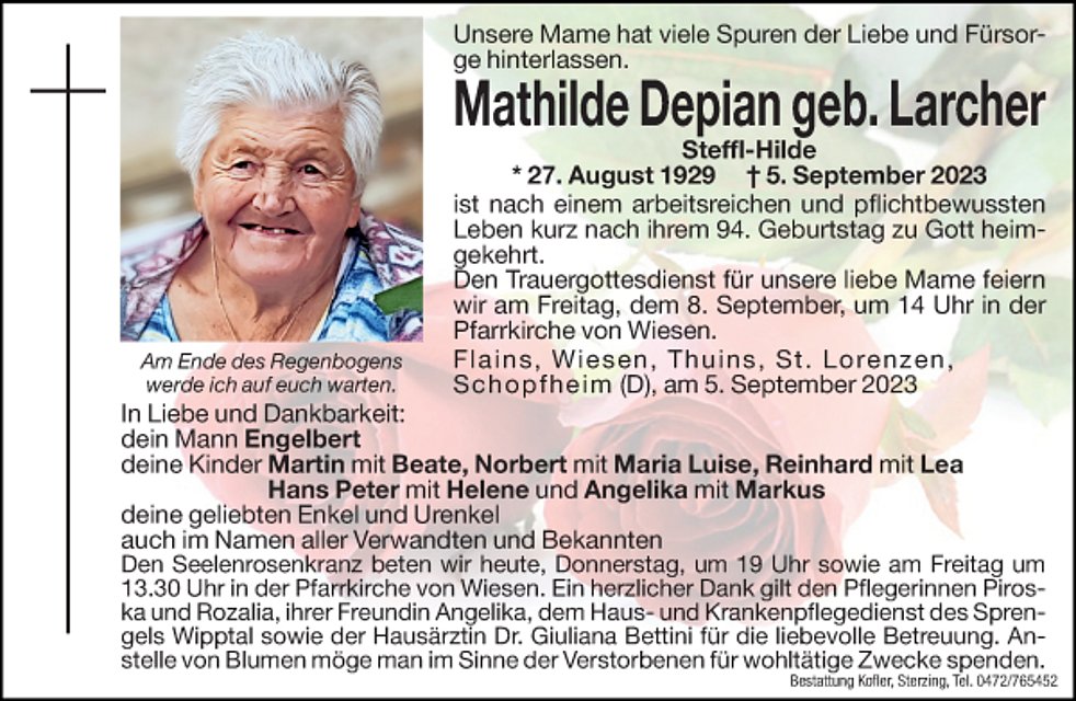 Ein herzlicher Dank gilt den Pflegerinnen Piroska und Rozalia, ihrer Freundin Angelika, dem Haus- und Krankenpflegedienst des Sprengels Wipptal sowie der Hausärztin Dr. Giuliana Bettini für die liebevolle Betreuung.
