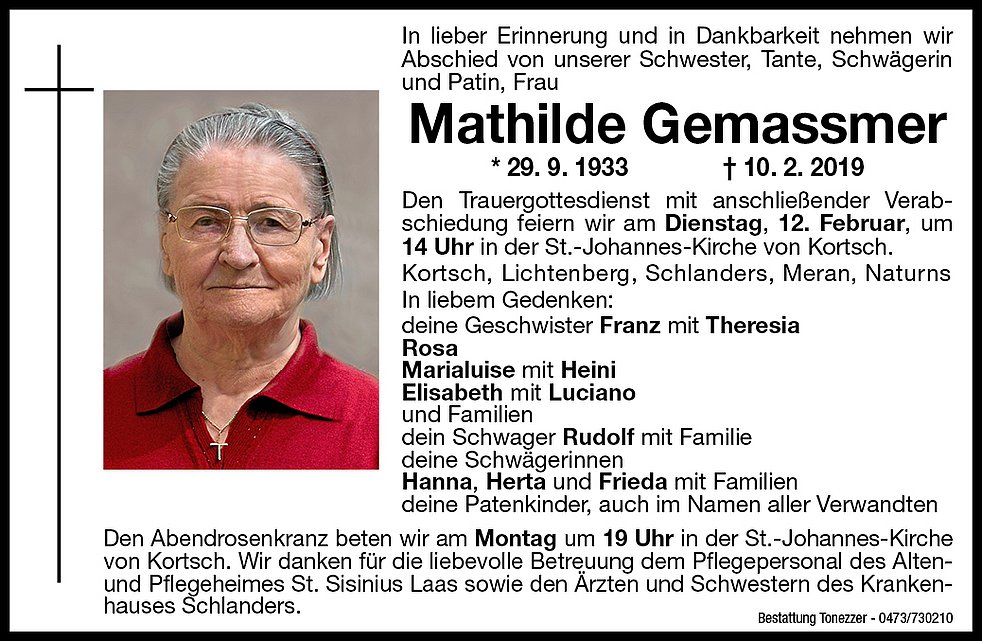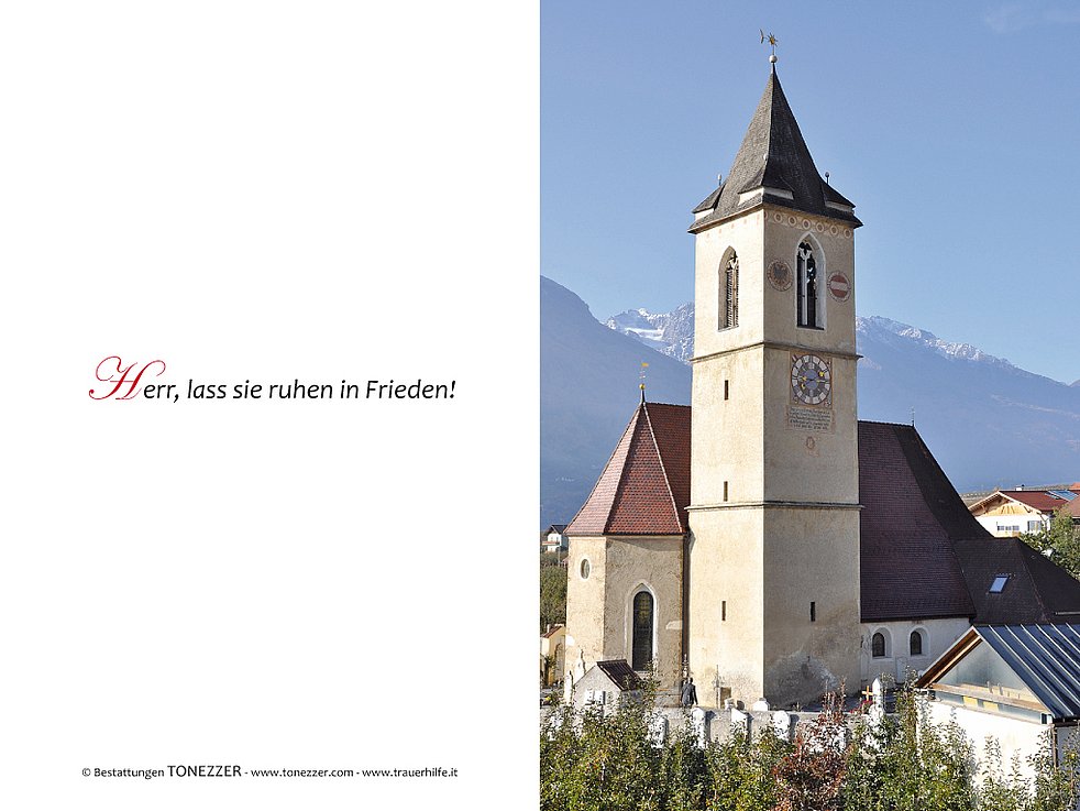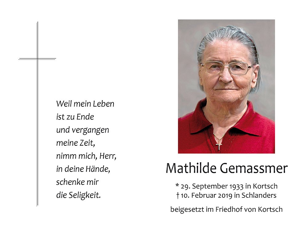 Wir danken für die liebevolle Betreuung dem Pflegepersonal des Alten- und Pflegeheimes St. Sisinius Laas, sowie den Ärzten und Schwestern des Krankenhauses Schlanders.