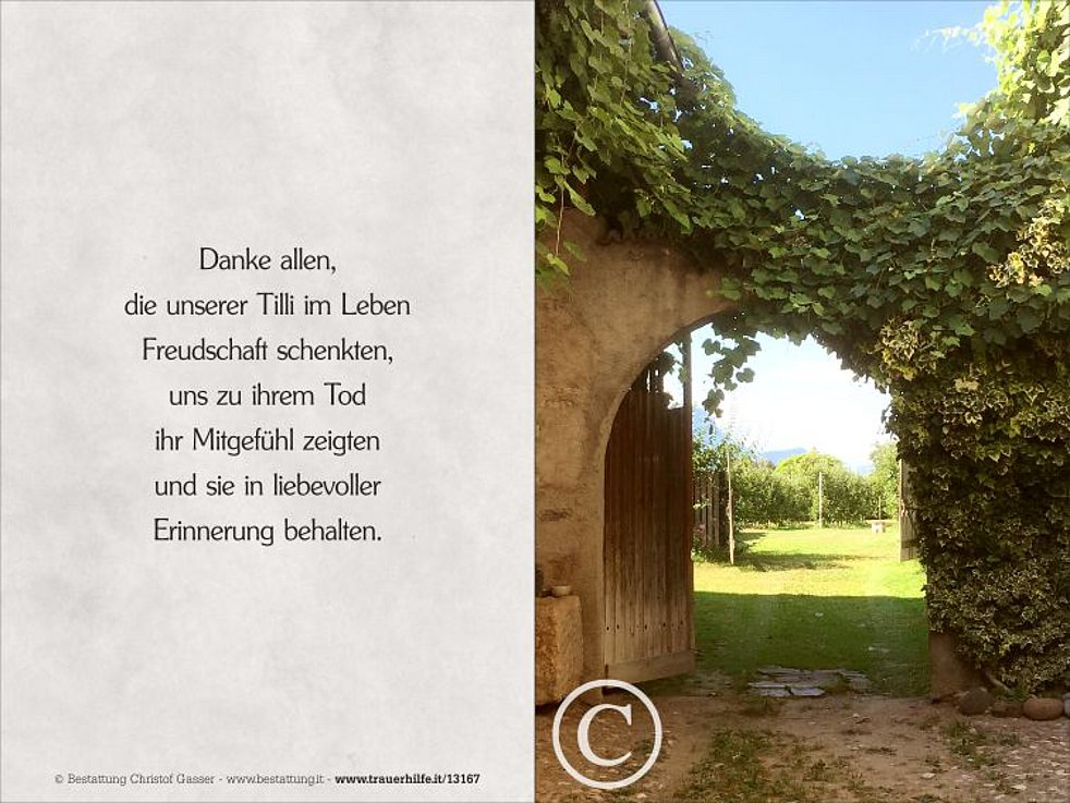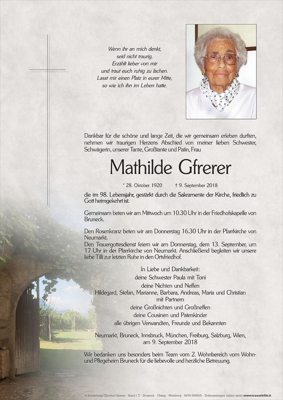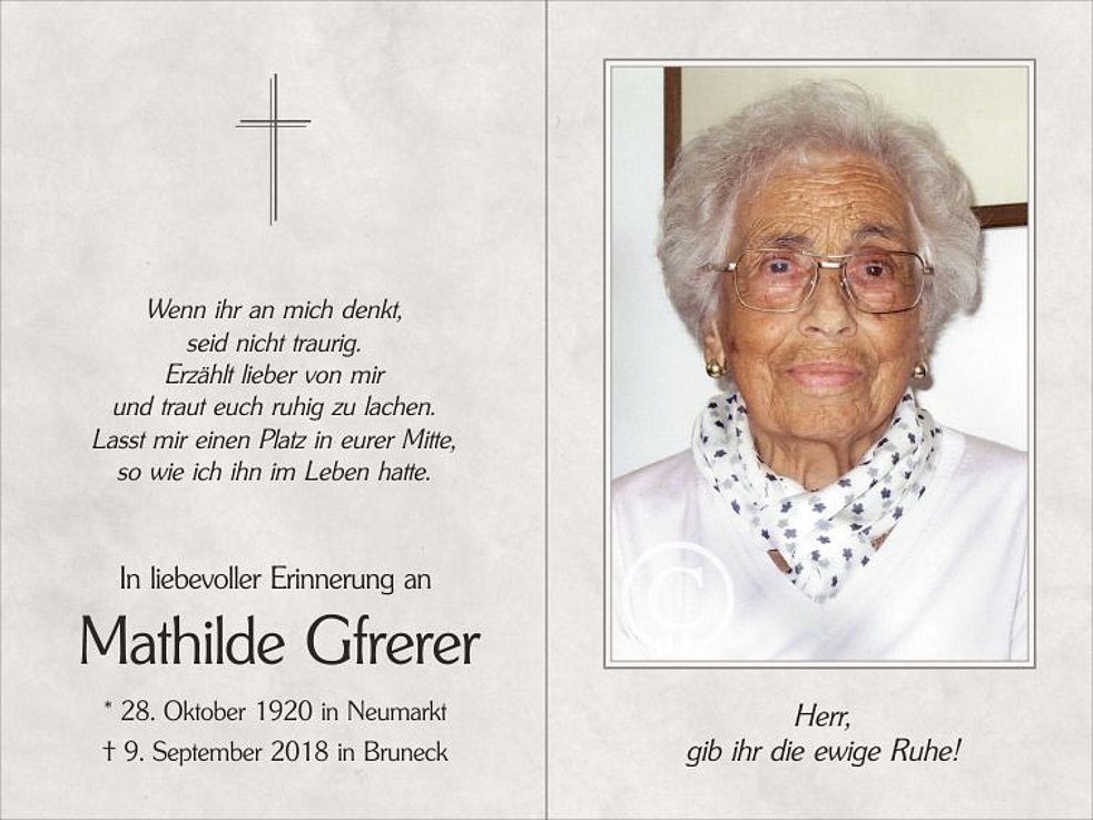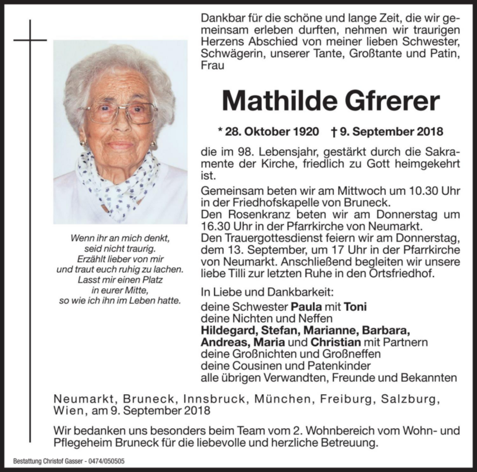 Den Trauergottesdienst feiern wir am Donnerstag, dem 13. September, um 17 Uhr in der Pfarrkirche von Neumarkt. Anschließend begleiten wir unsere liebe Tilli zur letzten Ruhe in den Ortsfriedhof.