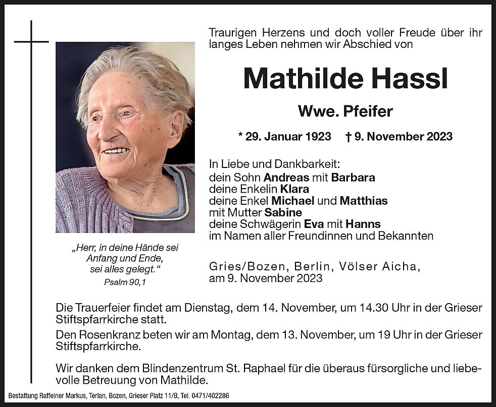 Die Trauerfeier findet am Dienstag, dem 14. November um 14.30 Uhr in der Grieser Stiftspfarrkirche statt.