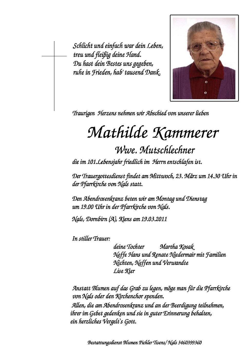 die im 101.Lebensjahr friedlich im Herrn entschlafen ist.