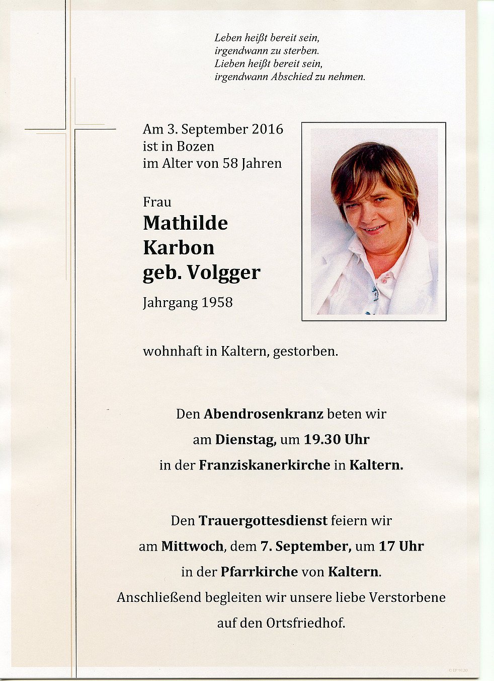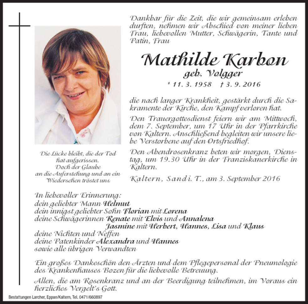 Den Trauergottesdienst feiern wir am Mittwoch, dem 7. September um 17 Uhr in der Pfarrkirche von Kaltern. Anschließend begleiten wir unsere liebe Verstorbene auf den Ortsfriedhof.