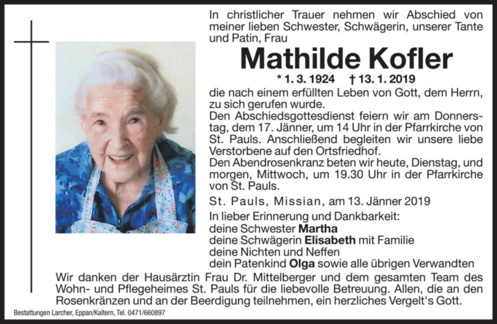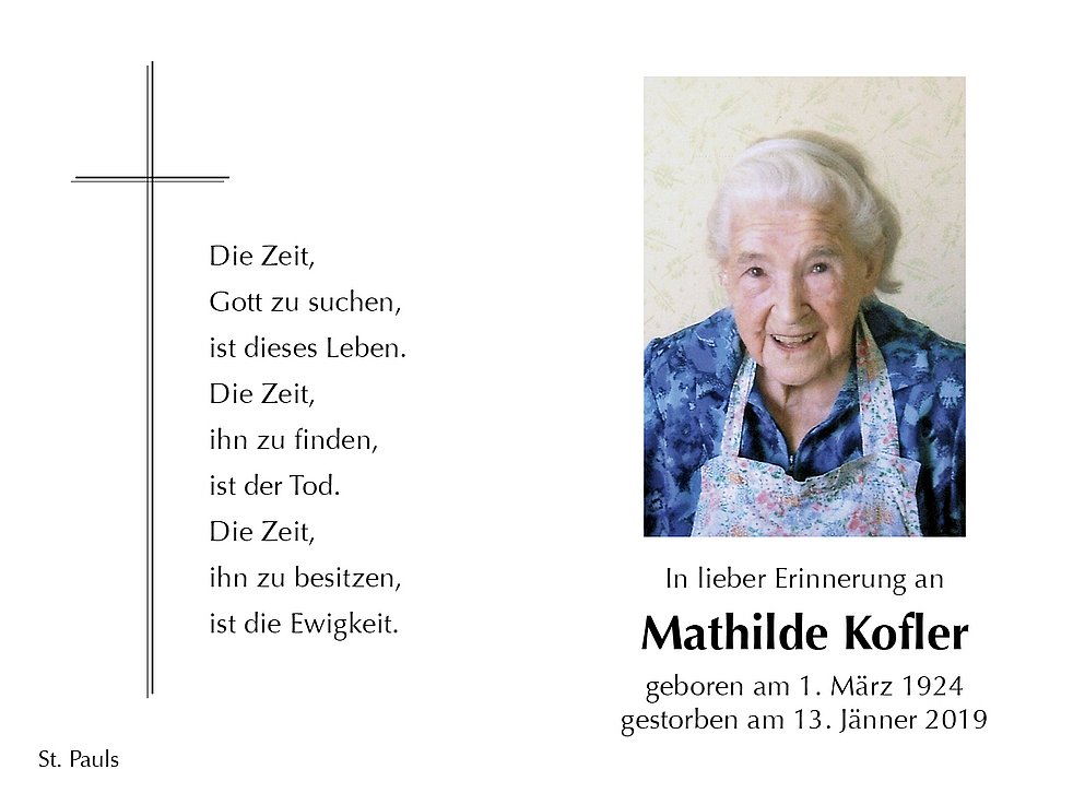 Den Abschiedsgottesdienst feiern wir am Donnerstag, dem 17. Jänner um 14 Uhr in der Pfarrkirche von St. Pauls. Anschließend begleiten wir unsere liebe Verstorbene auf den Ortsfriedhof.