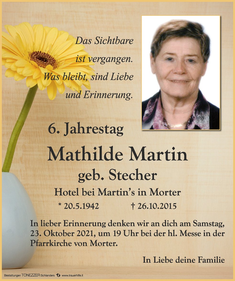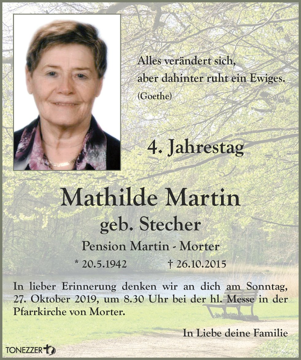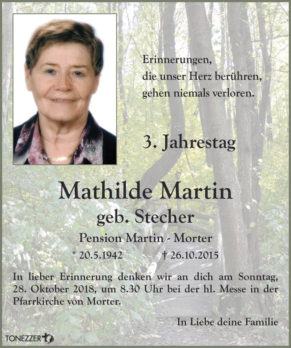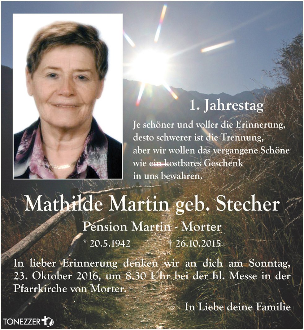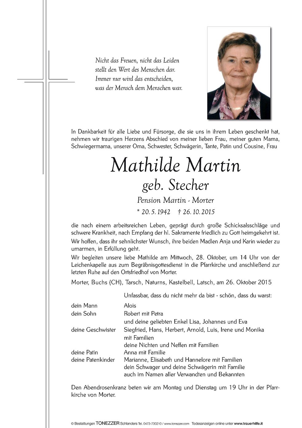 Wir begleiten unsere liebe Mathilde am Mittwoch, 28. Oktober, um 14 Uhr von der Leichenkapelle aus zum Begräbnisgottesdienst in die Pfarrkirche und anschließend zur letzten Ruhe auf den Ortsfriedhof von Morter.