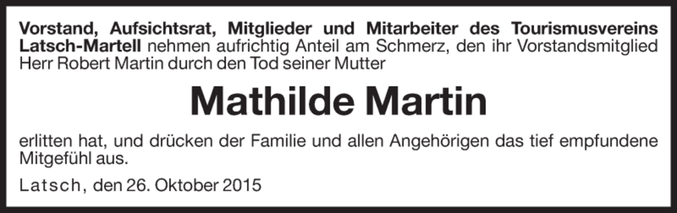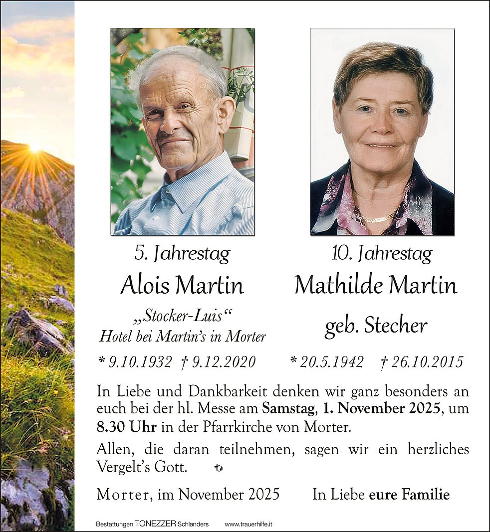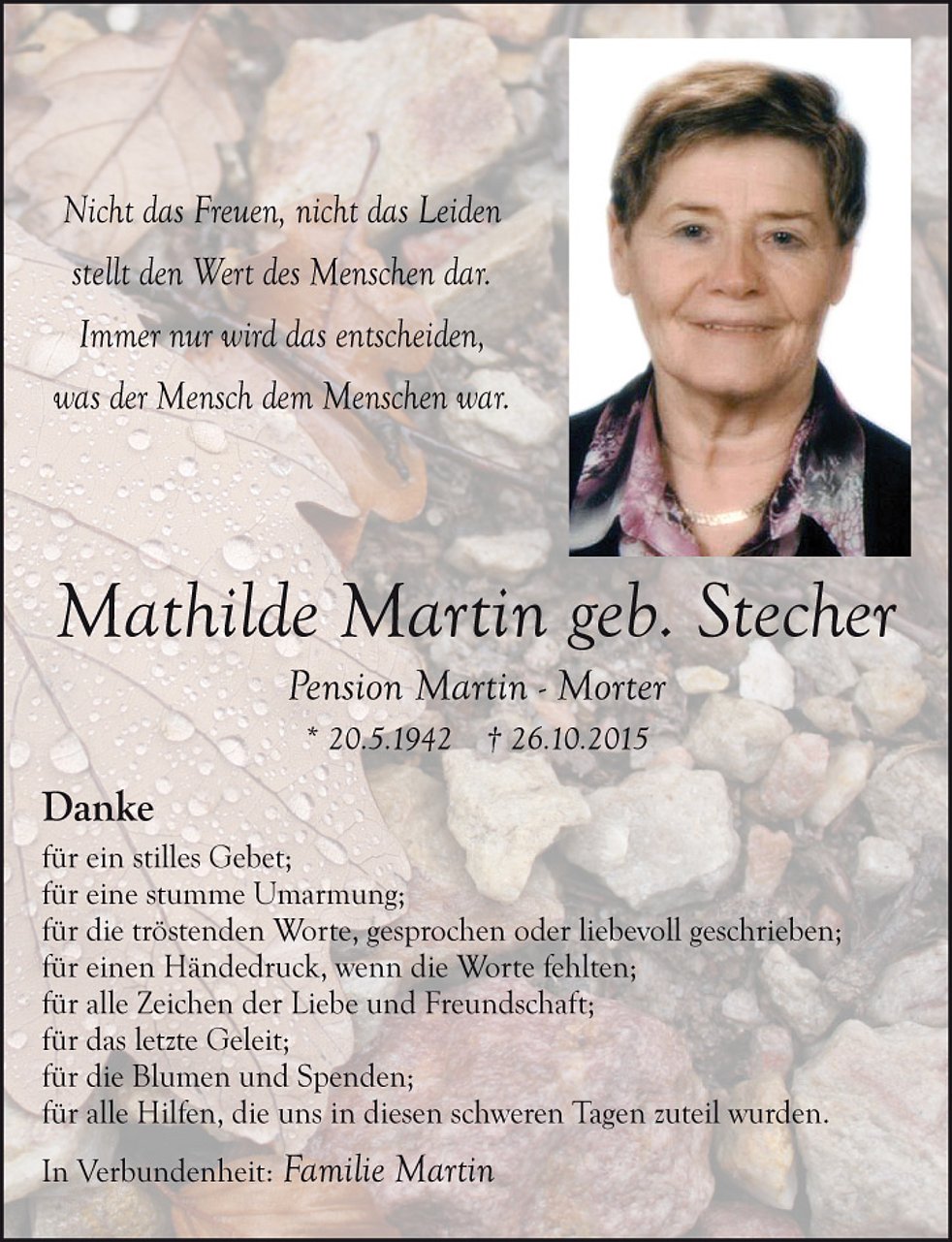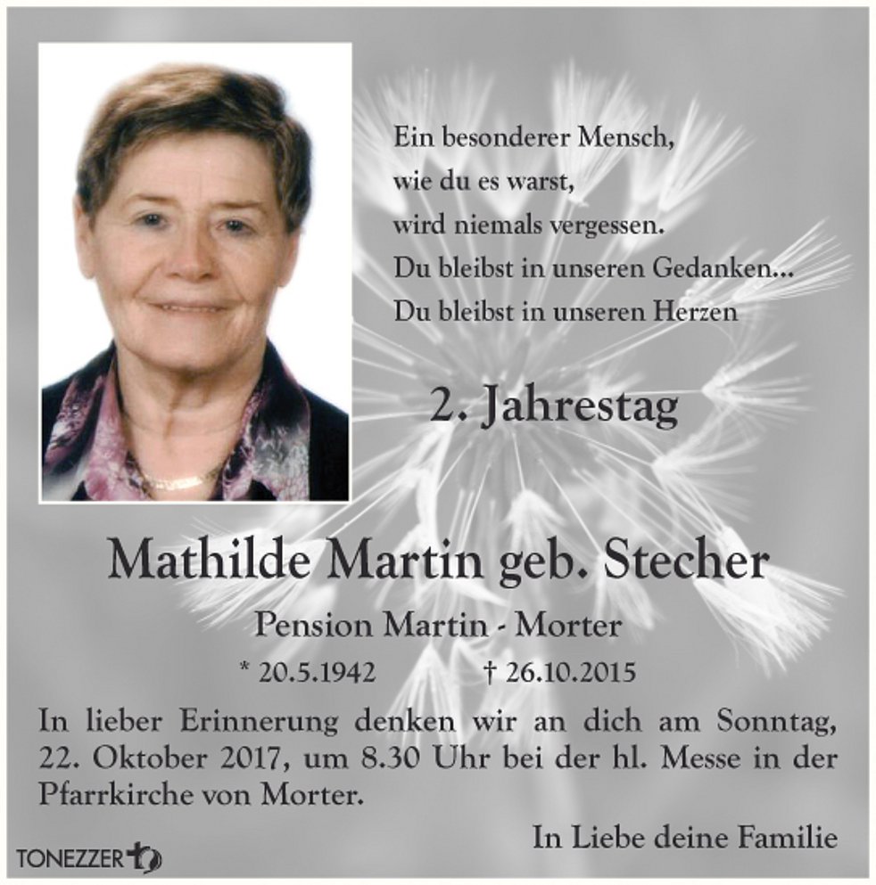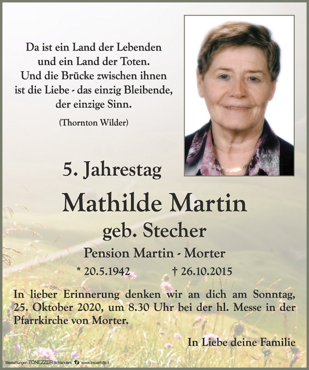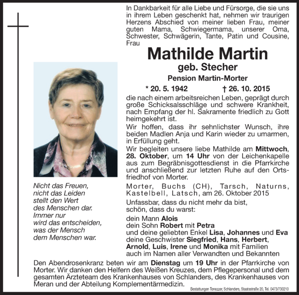 Wir begleiten unsere liebe Mathilde am Mittwoch, 28. Oktober, um 14 Uhr von der Leichenkapelle aus zum Begräbnisgottesdienst in die Pfarrkirche und anschließend zur letzten Ruhe auf den Ortsfriedhof von Morter.