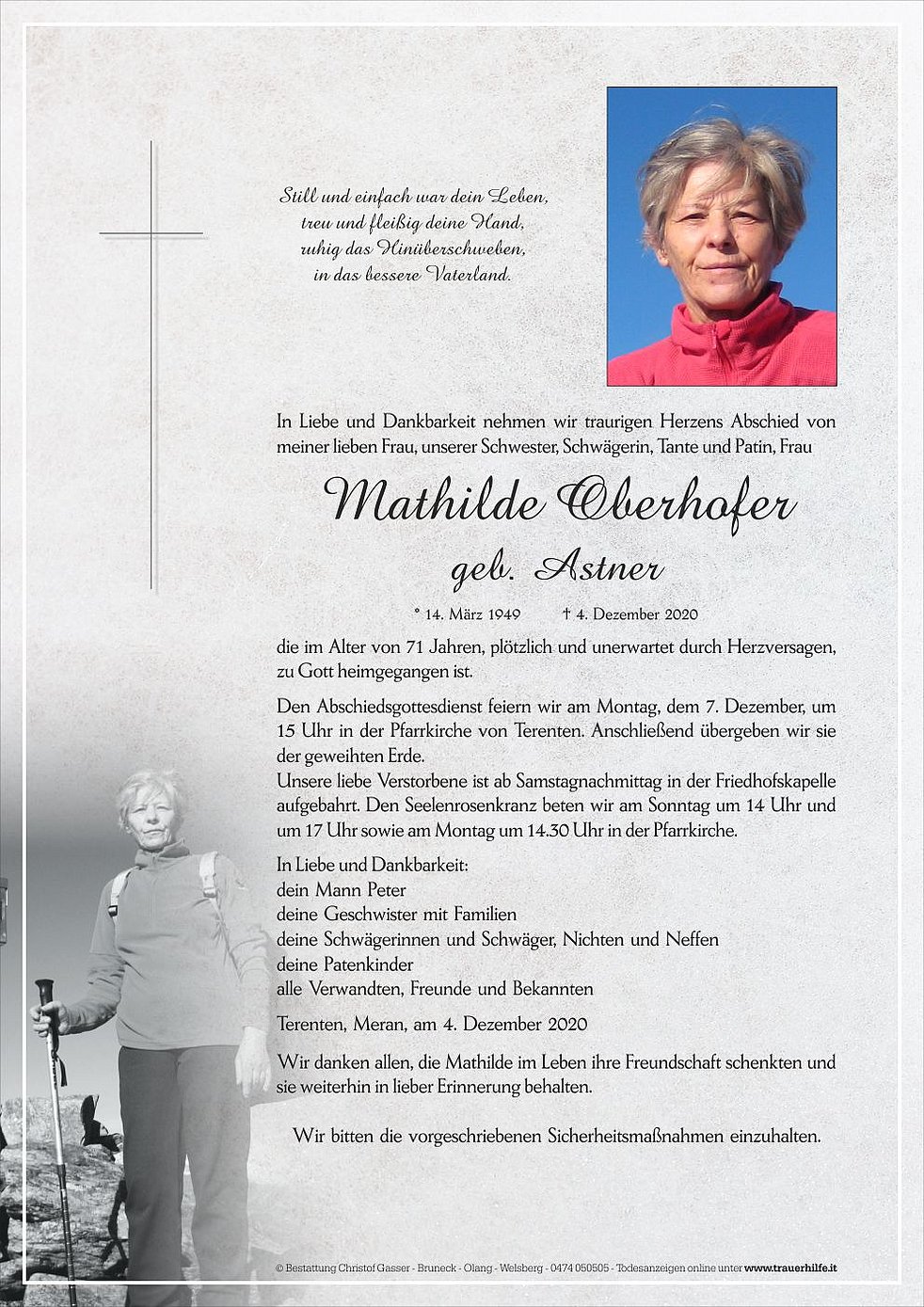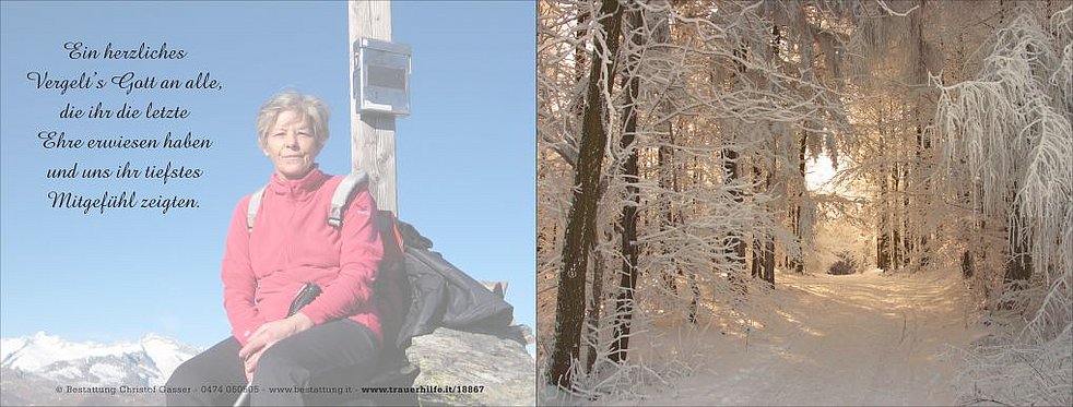 Den Abschiedsgottesdienst feiern wir am Montag, dem 7. Dezember, um 15 Uhr in der Pfarrkirche von Terenten. Anschließend übergeben wir sie der geweihten Erde.