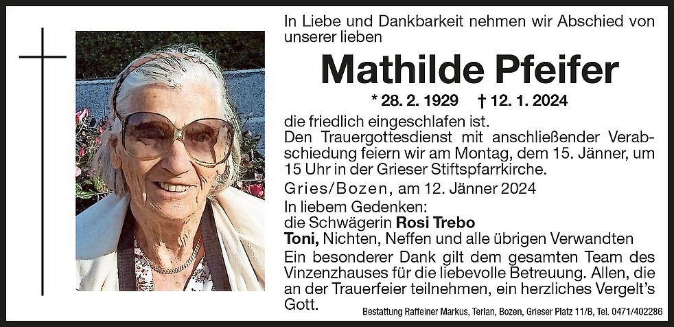 Den Trauergottesdienst mit anschließender Verabschiedung feiern wir am Montag, dem 15. Jänner, um 15 Uhr in der Grieser Stiftspfarrkirche.